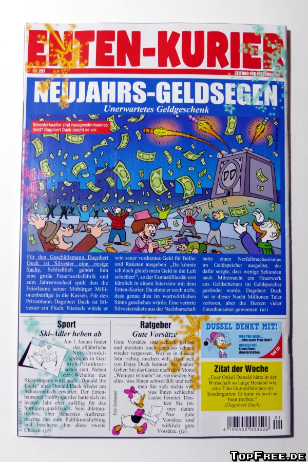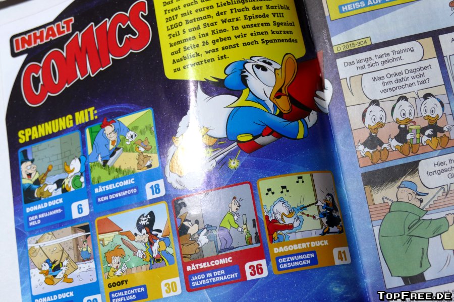 Den größten Teil vom Inhalt nehmen Comics ein. Ein Einseiter Donald Duck („Heiss auf dem Eis“), der „Super-Comic“ von und mit Donald Duck und einem weiteren von der Ente aus Entenhausen, zwei Rätselcomics, einem Goofy-Comic, Witzen, Infos und Dagobert Duck. Meiner Meinung nach ein gelungener Mix, bei dem der Comicanteil sehr groß ist. Die Donald-Comics mit den Neffen Tick, Trick und Track sind irgendwie süß und witzig. Goofi – „Schlechter Einfluss“ – sollten sich auf jeden Fall alle Eltern durchlesen, denn die Botschaft, dass Kinder auch mal mehr Spielen sollten und dabei ihre Fantasie spielen lassen und nachahmenswert! Tja und Dagobert ist wie eh und je hinter den Talern her. Besonders gelungen finde ich die Info- und Wissenstexte unter den Comicstrips. Denn dort erfährt man nicht nur etwas über Entenhausen, sondern auch über rosa Elefanten oder die Schaltsekunde. Eine gelungene Abwechslung für Groß und Klein stellen die Rätselcomics auf je einer Seite dar. Abgerundet wird das Magazin durch ein Spezial, dass neue Filme und Konsolen für das kommende Jahr vorstellt. Zudem erfährt man alles über die Geburtstagstermine aus dem Hause Walt Disney. Daisy und der 313 werden am 09.01.2017 80 Jahre alt, Goofy am 25.5. 85 und Mack & Muck am 18.9. 85. Gamma am 26.9. 70 und Tick, Trick und Track am 17. Oktober 80. Zudem wird Geizhals Onkel Dagobert im Dezember 70. Viele Jubiläen stehen also in diesem Jahr an. Die Kategorie W.O.W. (Wahnsinn oder Wahrheit) bietet diesmal Informationen über die mutigen Skiadler. W.T.T. (Witze, Tipps und Tricks) allerlei kleines Wissen inklusive dem Streich der Woche und die Maus Box die wenige Fanpost mit dem Fan der Woche. Nicht zuletzt dürfen in einem weiteren Spezial die guten Vorsätze der Entenhausener fehlen sowie eine Seite mit Witzen. Der Witz der Woche stammt dabei von einem Leser und wer einen einschickt der abgedruckt wird, erhält „eine spannende Comic-Überraschung“. Lustig fand ich zudem den Enten-Kurier auf der Umschlag-Rückseite. Allerdings muss man dazu sagen, dass sehr oft der Hinweis kommt, dass man auf der Internetseite von Micky Maus noch mehr oder weitere Informationen erhält. Das Portal für Kinder bietet unter anderem auch eine Registrierung zur Teilnahme an Spielen und mehr. Hierbei zeigt sich wohl auch, dass man mehr und mehr auf das Internet setzt beziehungsweise setzen muss. Aufgrund von weiteren Werbeeinnahmen? Werbung im Heft ist sehr wenig vorhanden. Zwei Seiten für zwei Fernsehsender. Dazu noch eine Eigenwerbung für das Abo. Das war es auch schon. Eine Seite bietet übrigens noch die Wahl zum Wunschcomic. Leider nur über das Internet und … die Seite habe ich tatsächlich nicht gefunden, wo man aus einem der drei abgebildeten Comics seinen Favoriten wählen kann.