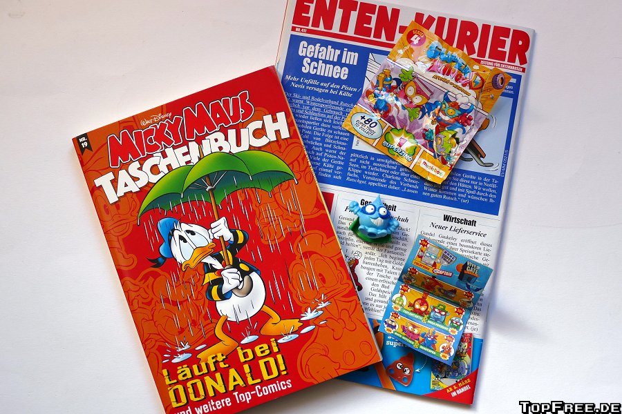 Das Micky Maus Magazin erscheint alle zwei Wochen. Die wöchentliche Erscheinungsweise ist schon lange gestrichen. Dafür beträgt der Preis mittlerweile aber auch stolze 3,99 Euro. Die Beilage, also das Gimmick, ist meist – Sorry! – Plastikmüll. Bei dieser aktuellen Ausgabe aber interessant. Denn als Beilage gibt es dieses Mal ein Micky Maus-Taschenbuch oder Comic-Buch. Bei meinem am Zeitschriftenladen letzten erhältlichen Micky Maus Magazin lag die Nummer 19 aus dem Jahre 2020 bei. Zunächst dachte ich, es wäre sogar das aktuelle, was ich mir aber nicht vorstellen konnte. Denn im Taschenbuch war dauernd Werbung für weiter Hefte. Angespriesen für den „14.02.“ oder, dass das nächste Buch am „20. März im Handel“ ist. Das passt zeitlich natürlich alles, aber ist halt vor von einem Jahr. „Läuft bei Donald“ lautet der Titel des 148-seitigen Comicbuches im Taschenformat. Das ist eine richtige gute Beilage, kostet das Taschenbuch regulär 4,99 Euro – also mehr als der Heftpreis. Klar, ist es hier eine Resteverwertung, aber wenn man es noch nicht hat, bekommt man Comic en massse. Dazu liegt noch eine eingepackte Figur aus der „SuperZings Serie 4“ dabei.