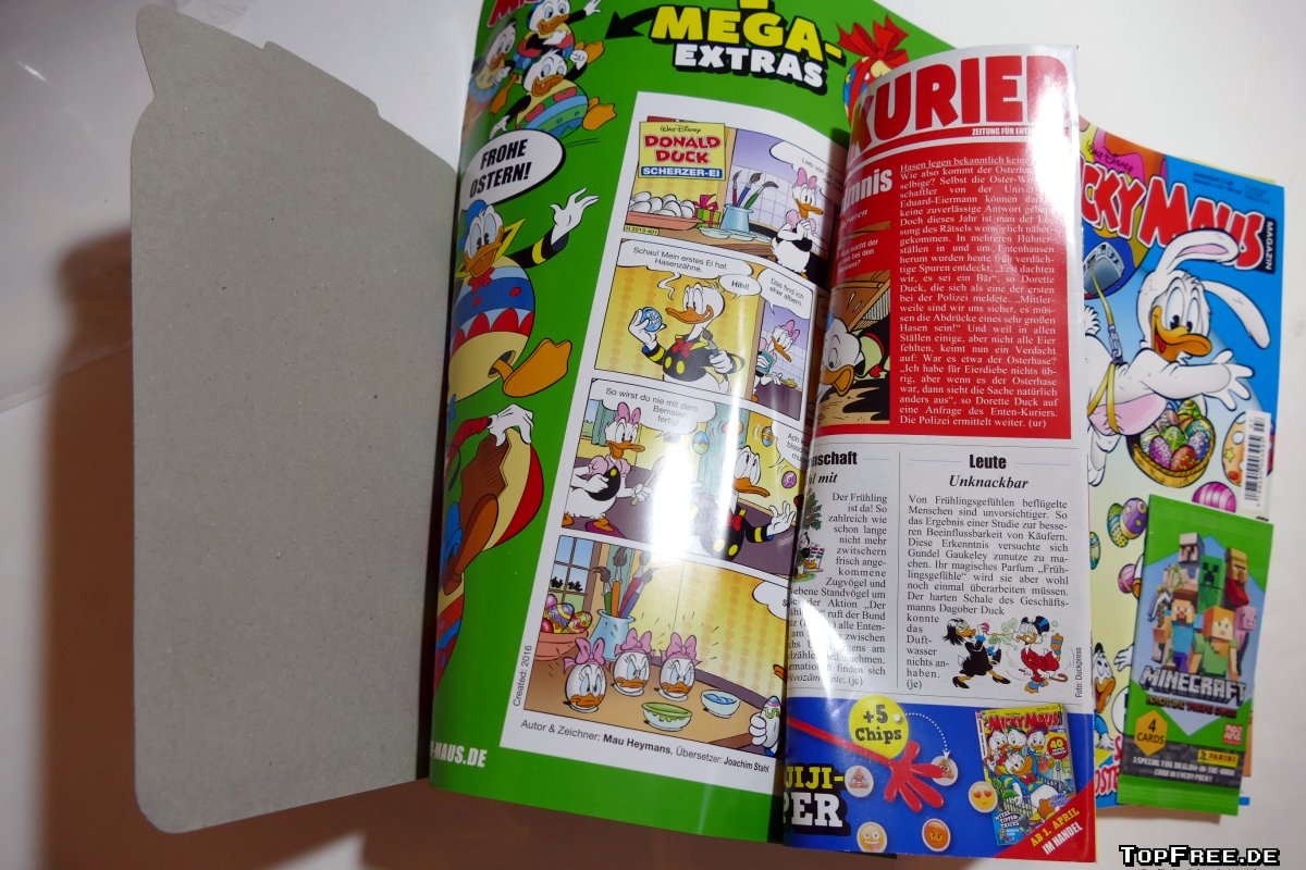 Begonnen wird das aktuelle Heft mit dem „Frohe Ostern!“-Gruß der Redaktion und dem obligatorischen Startlacher. Es folgen die Comics „Dagobert Duck: Eine App für Eier“ (Skript: Peter Snejbjerg, Zeichnungen: Wanda Gattino, Übersetzung: Harry Nützel, Seite 5 bis 14), mit aktuellem Smartphone App Bezug, „Micky Maus: Wunder der Dressur (Carl Fallberg, Paul Murry, Dr. Erika Fuchs, Seite 16 bis 20), „Donald Duck: Trockenrudern (Jim Kenner, Vicar, Dr. Erika Fuchs, Seite 22), „Rätselcomic: Zertrampelte Blumen“ (Jaakko Seppälä, Miguel, Joachim Stahl, Seite 24), „W.T.T. – Bon Appetit!“ (Seite 26 und 27), „Donald Duck: Der Geldversteher (Gaute Moe, Massimo Fecchi, Anne-Marie Wachs, Seite 28 bis 34), „Rätselcomic: Einer von Dreien (Miguel, Joachim Stahl, Seite 35), „Donald Duck: Monstermäuse“ (Mau Heymans, Comicup, Arne Voigtmann, Seite 38 bis 49) und der Witze-Seite mit dem Witz der Woche: Kommt ein Glühwürmchenkind weinend nach Hause. „Aber warum weist du denn, mein Kind?“, fragt die Glühwürmchenmutter besorgt. „Ach Mami, meine Mathematiklehrerin hat heute gesagt, dass ich nie eien große Leuchte werde!“ … und weiteren Witzen. Auf der letzten Seite wird das Magazin mit dem legendären Enten-Kurier vollendet. Ein Bonus-Comic auf der Pappbeiliga ist passend zu kommende Ostern: „Donald Duck: Scherz Ei“ (Autor & Zeichner: Mau Heymans, Übersetzer: Jo Stahl).