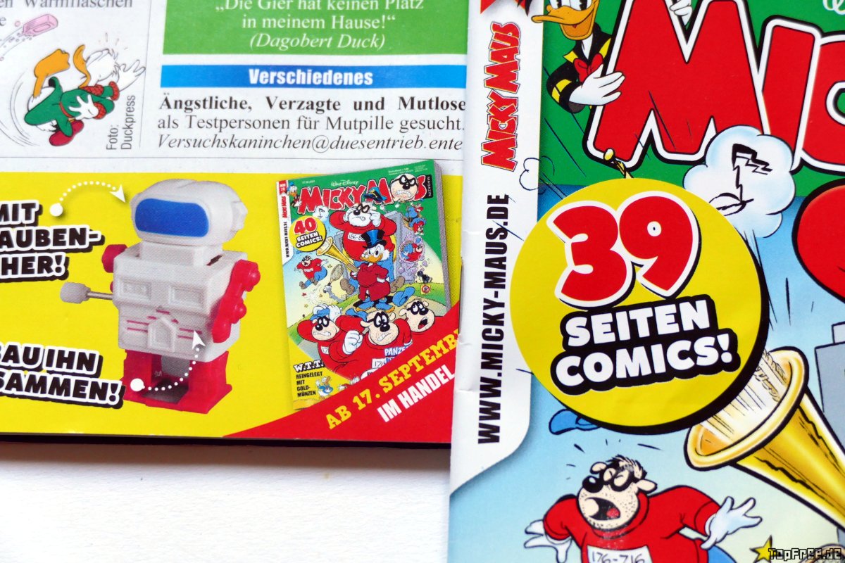 Ja, ich gebe zu: Ich bin ein Gimmick-Käufer. Ob die jüngere Generation auch noch so denkt? Ich denke schon! Denn im Zeitschriftenregal gibt es allerhand (minderwertige) Magazine mit (meist leider ebenso minderwertigen) Beilagen. Dieses Extra bietet neben Plastik aber tatsächlich mehrere Aspekte: Zusammenbauen, Schrauben und Spielen. Also gar nicht so schlecht. Zudem sieht der Roboter noch ganz süß aus, aber das ist wohl Ansichtssache. Helferlein zu basteln, wäre man etwas gewesen, doch der Roboter von Daniel Düsentrieb fährt halt nur auf einem Rad. Als Comic einfacher zu zeichnen als zu basteln und hinzustellen.