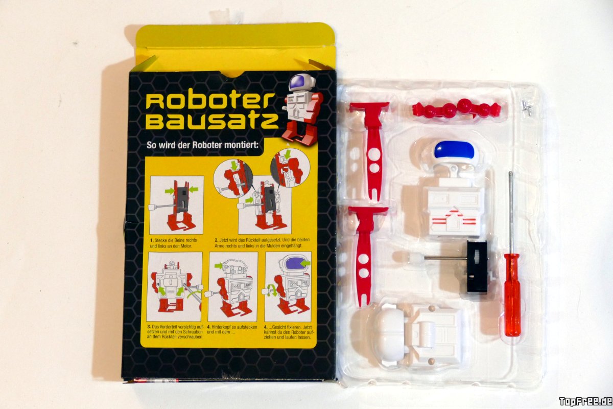 Auf der Rückseite der Verpackung des Roboters befindet sich die bebilderte Kurzanleitung. Nicht ganz klar ist, wie die Arme positioniert werden. Laut der Anleitung ist der rechte Arm vorne, der linke weiter hinten. Auf allen Bildern ist es umgekehrt. Tatsächlich spielen die Roboterarme am Ende eine Rolle. Ansonsten ist alles, teilweise etwas friemelig, zum Zusammenstecken. Ist der Motor mit den Beinen aber richtig eingelegt, wird alles nur noch aufgesteckt und der Rücken mit dem Vorderteil zusammengeschraubt. Dafür liegen zwei kleine Kreuzschrauben inklusive passendem Schraubenzieher bei. Hey, ein neuer Schraubenzieher! Praktisch. Bei meinem ersten Versuch waren die Arme nicht ganz richtig eingelegt. Sprich: Der Roboter lief nicht. denn es verhakte sich im Inneren immer wieder. Nach ein paar Versuchen wackelte der Roboter ein paar Schritte und … fiel um. Wer Spaß am Basteln hat, kann ein wenig Finetuning vornehmen. Ganz witzig ist, dass der Kopf mit wackelt. Sieht irgendwie wieder süß aus.