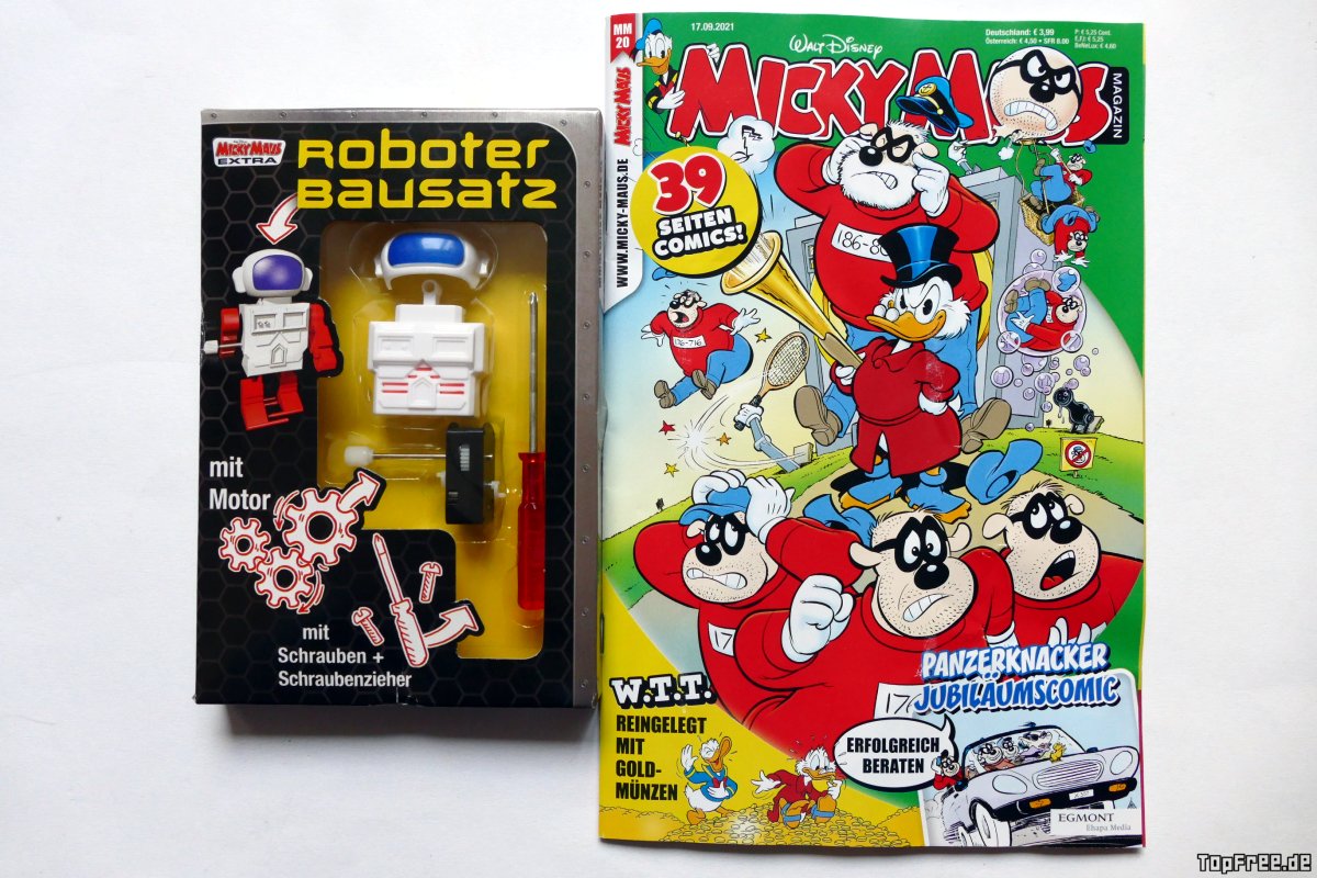 Nachdem im letzten Heft Gundel Gaukeley ihr Jubiläum feierte (19/2021 im Test), sind jetzt die legendären Panzerknacker an der Reihe. Zudem gibt es im Micky Maus Magazin Ausgabe 20 einen Roboter-Bausatz als Beilage.