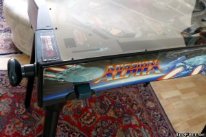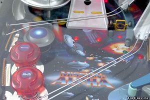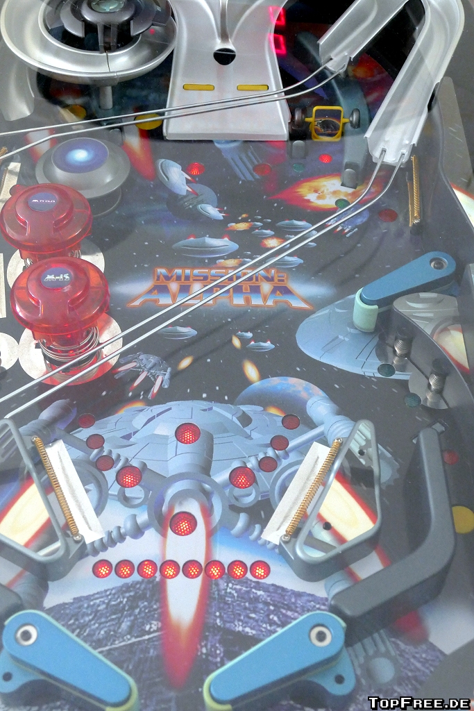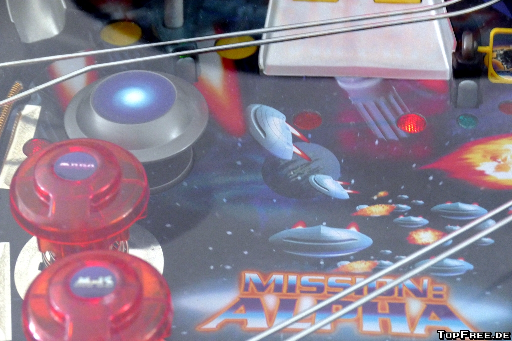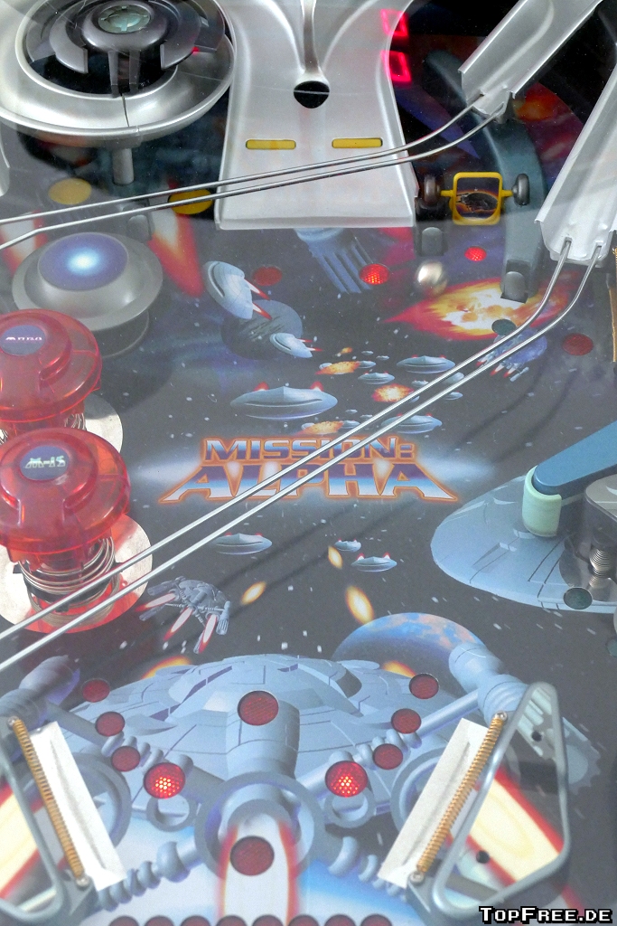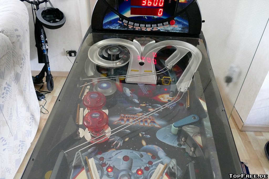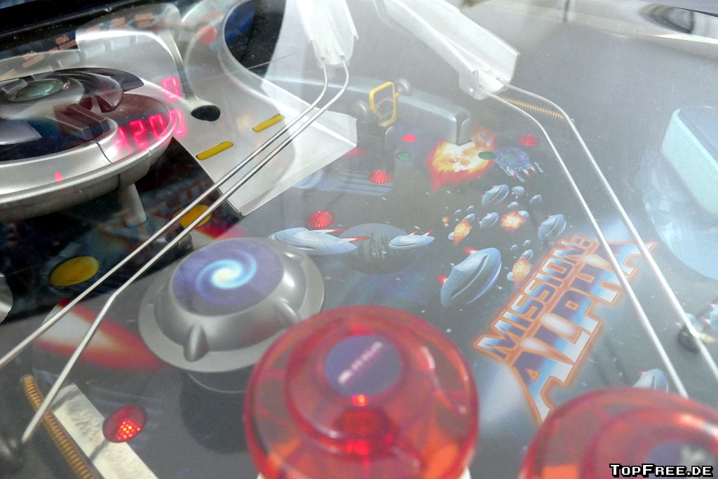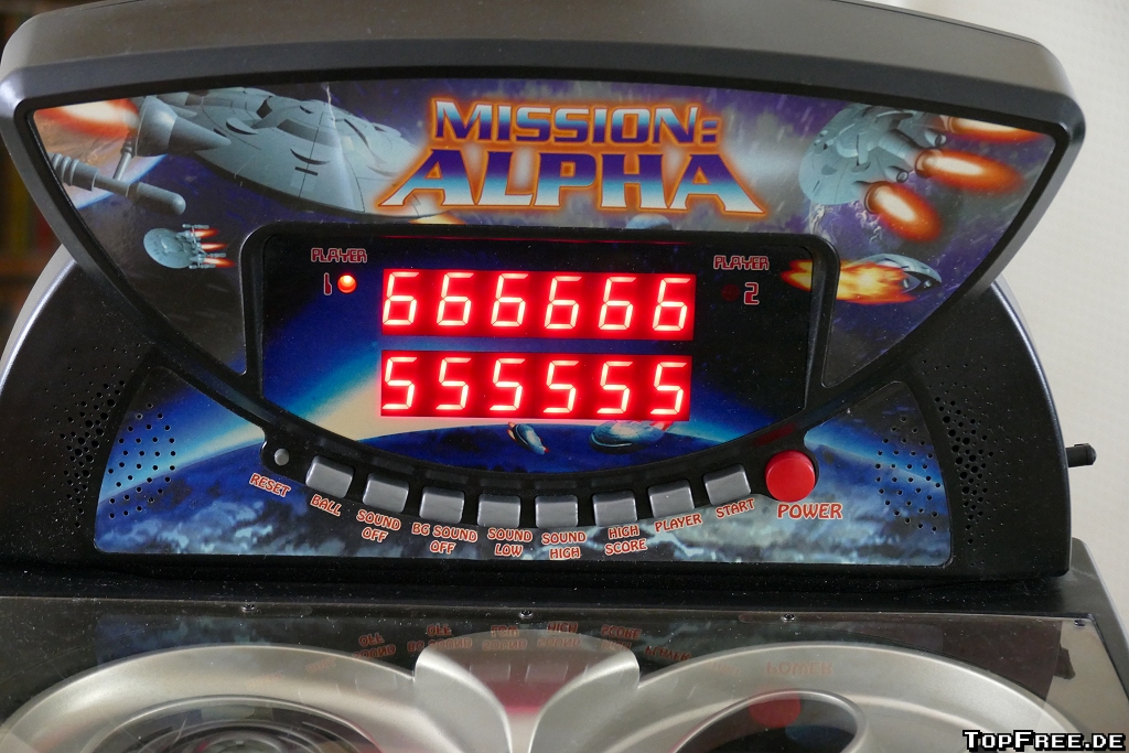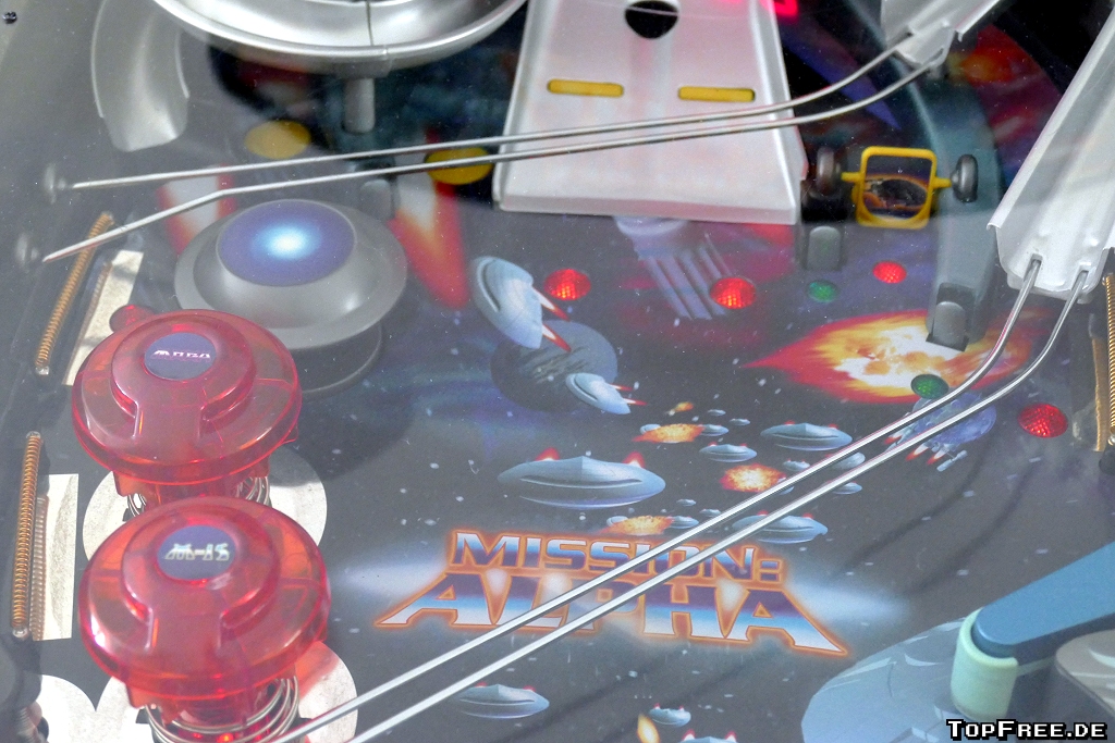 Mission: Alpha lautet der Name der Pinball-Maschine. Als einziges Modell seiner Reihe mit zwei Punktedisplays – eins zeigt den Gesamtspielstand an, und eines die aktuelle Punktzahl – kommt dieser als Spielzeug ausgelegte Plastikflipper natürlich ohne Münzeinwurf aus. Einfach an den Strom anschließen und los geht es. Bei einem Gewicht von nur ~10 Kilogramm lässt sich der Flipper einfach im oder auf oder auch unter dem Schrank verstauen. Denn die Beine sind abschraubbar und der Flipper auch als Tischflipper nutzbar. Die Montage ist demnach denkbar einfach: Beine dranschrauben, das Display aufsetzen und fertig.