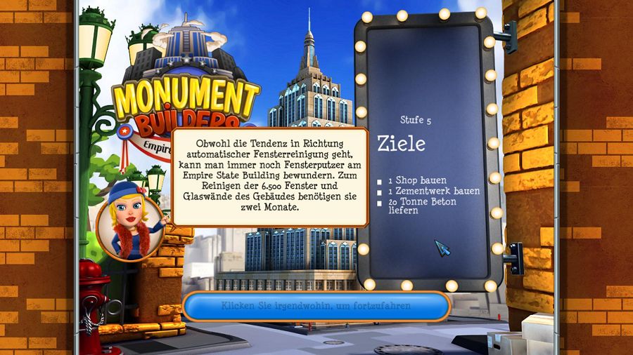 Das Gegen-die Zeit-Aufbau-Spiel Monument Builders: Empire State Building bietet ambitionierten Hobby-Architekten die vielleicht einmalige Möglichkeit, beim Bau eines weltberühmten Bauwerks dabei sein – zumindest virtuell. Dabei ver-schlägt es den Spieler in das New York der 1930er Jahre, wo er auch gleich mit einem Riesen-Projekt beauftragt wird: Dem Bau des Empire State Buildings! Von den ersten Aufräumarbeiten bis hin zur Produktion und Beschaffung der benötigten Baumaterialien und der Erneuerung von Straßen rund um das Areal stehen in 50 herausfordernden Bau-Levels zahlreiche Aufgaben auf dem Generalplan. Vorsicht vor der Konkurrenz – zuweilen versuchen böse Neider, das Bauvorhaben zu sabotieren. Doch nicht zuletzt dank der bezaubernden Assistentin Miranda behält der Protagonist den Überblick und weiß stets, was zu tun ist, damit am Ende das legendäre Gebäude in seiner ganzen Pracht erstrahlt.