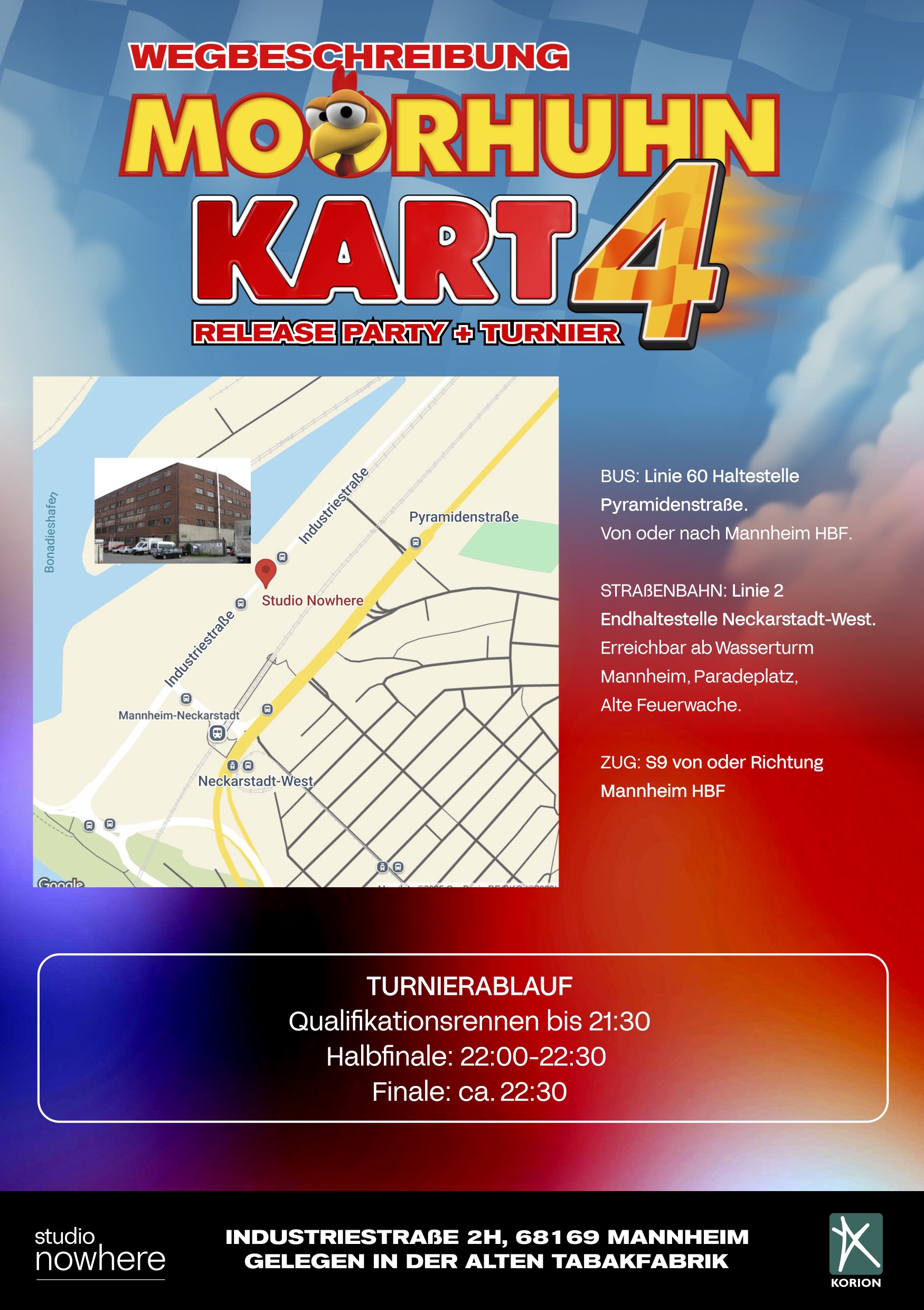 Moorhuhn Kart 4 Release Party + Turnier Tobi| Käuflich|19. Februar 2025 Am Freitag, 14. März 2025, wird eine Moorhuhn Kart 4 Release Party mit Turnier gefeiert. Entwickler Korion Interactive lädt dazu in das Studio Nowhere in Mannheim ein: Ähnliche Artikel: Moorhuhn Kart 4 kommt! Moorhuhn die ersten 10 Jahre – Fürn 5er! Moorhuhn: Tiger & Chicken vorbestellbar Moorhuhn: Volle doppelte Ladung – Das Moorhuhn-Paket ab heute für PC im Handel Moorhuhn schlägt zurück – Erscheint in Kürze und erster Trailer + Screenshots korion moorhuhn moorhuhn kart moorhuhn kart 4 releasetermine turnier veranstaltung