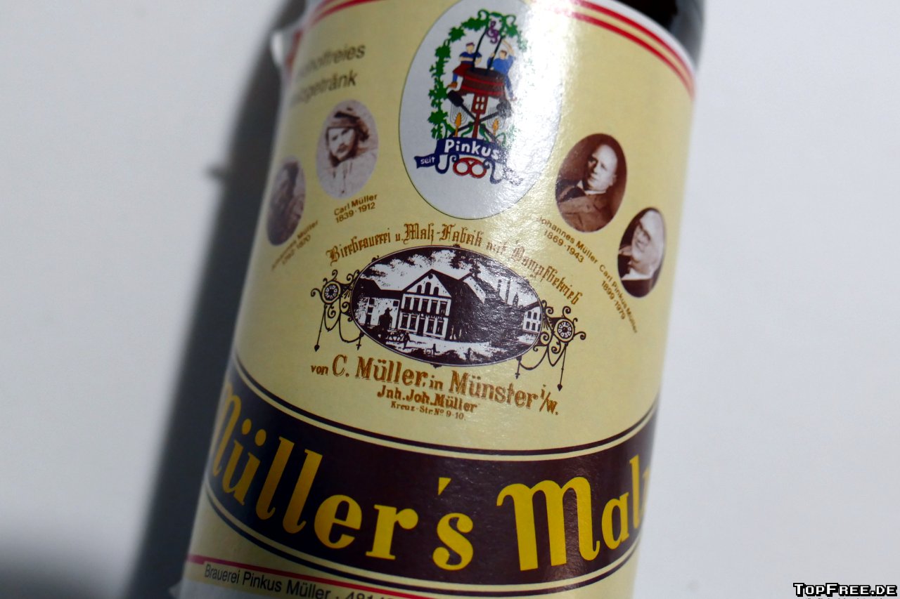 Pinkus hat auf dem Flaschenetikett oben mittig das Wappen – mit dem Schriftzug Pinkus seit 1816, sehr schön altmodisch gemalt – aufgedruckt und daneben links und rechts die Generationen, in sehr sehr kleiner Schrift: Johannes Müller 1792 · 1870 (auf der hauseigenen Webseite steht 1871, auf der Flasche 1870), Carl Müller 1839 · 1912, Johannes Müller 1869 · 1943 und Carl Pinkus Müller 1899 – 1979. Allesamt mit Konterfei. Darunter steht in altdeutscher Schrift und schlecht lesbar: „Bierbrauerei u. Malz-Fabrik mit Dampfbetrieb von C. Müller, in Münster i/w Jnh. Joh. Müller Kreuz-Str. N° 9-10.“ Danach folgt unterhalb des Aufklebers in großer Schrift „Müller’s Malz“. Sowie in kleinere Schrift ganz unten: Brauerei Pinkus Müller · 48143 Münster · Telefon 0251/45151 sowie noch ganz unten www.pinkus.de. Oben links des Aufklebeetiketts steht zudem noch: „Alkoholfreies Malzgetränk“. Hinzu kommt auf dem Flaschenhals nochmal das Logo „Müller’s Malz“ schief aufgeklebt. Die Rückseite ist mit den Zutaten in verschiedenen Sprachen (Deutsch, Englisch, Spanisch – Bebita a la malta, übersetzt so viel wie Baby Malz – Italienisch, Franzsösisch und Niederländisch) bedruckt. Hinzu kommt ein DE-Öko-006 Label, „EU/Nicht-EU Landwirtschaft“, Nährwertangaben und Haltbarkeitsdatum. Sowie ganz unten Monate von 1 bis 12 und die Jahreszhalen 2020, 2021 und 2022. Der Kronkorken hat übrigens entweder das Wappen oder die Aufschrift „Pinkus“ aufgedruckt.