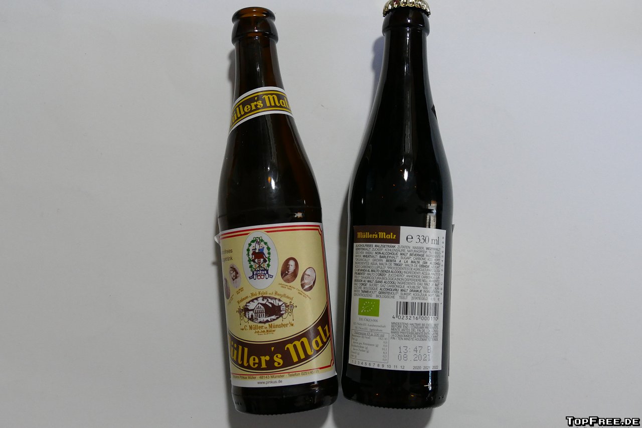 Denn für Bier interessiere ich mich tatsächlich nicht. Aber es war ja gar kein Bier, dessen Etikett mir zunächst ins Auge sprang, kurz zwinkerte und ich nur dachte: Ok, Bier. Ne, danke! Dann aber sah ich auf den zweiten Blick: „Müller’s Malz“, das steht da darauf. Malzbier? Ja sozusagen. Ein „alkoholfreies Malzgetränk“. Top! Normal schmecken mir solche Malzgetränke nicht sonderlich gut. Bei Karamalz hatte ich gehofft, hier wollte ich es einfach noch einmal versuchen. Direkt zwei Flaschen mitgenommen, denn die Flasche lag bei 0,79 Euro (plus Pfand) und war ein Angebot des Ladens.