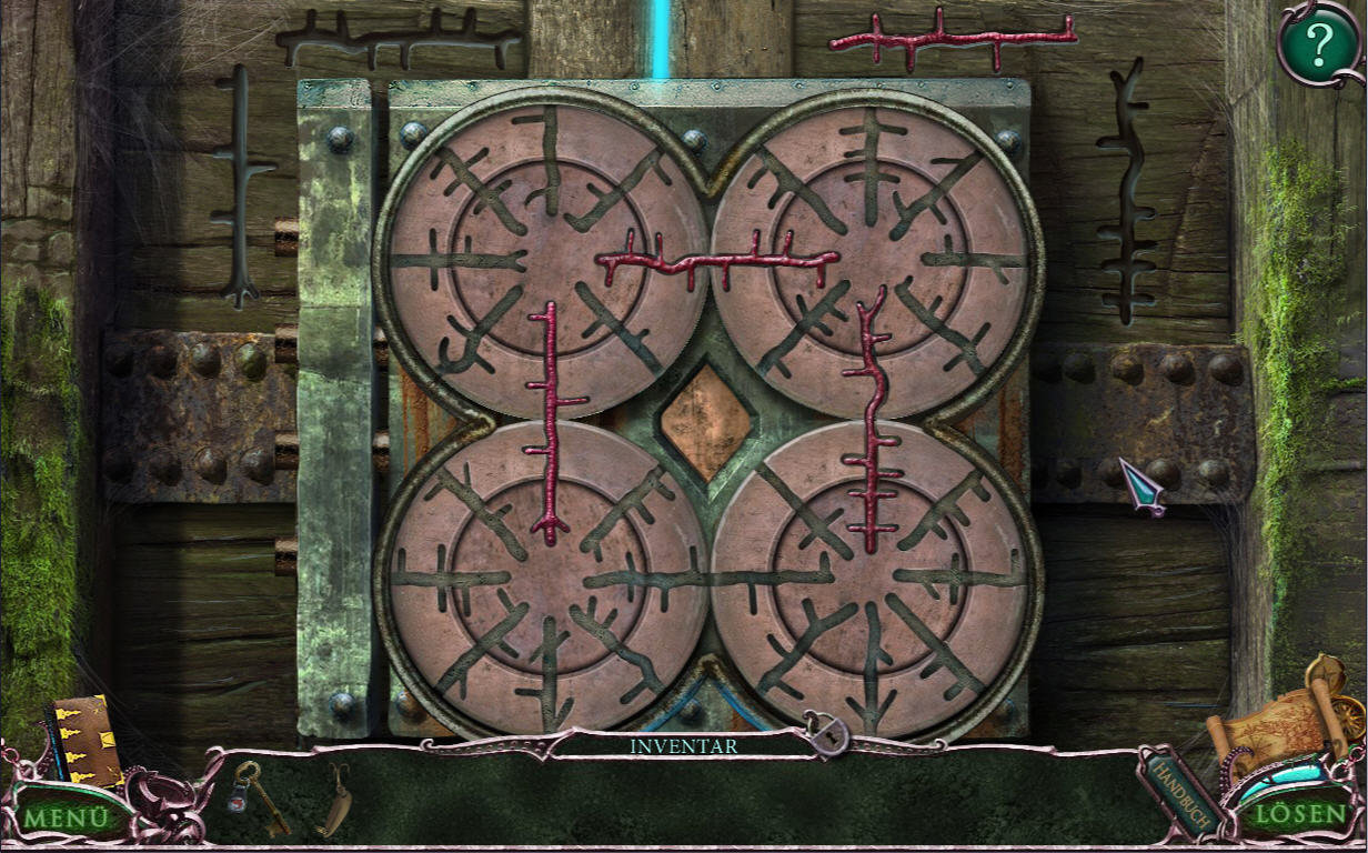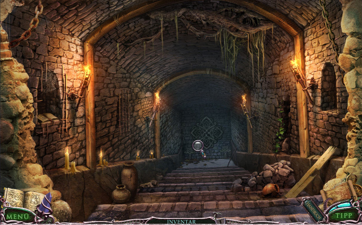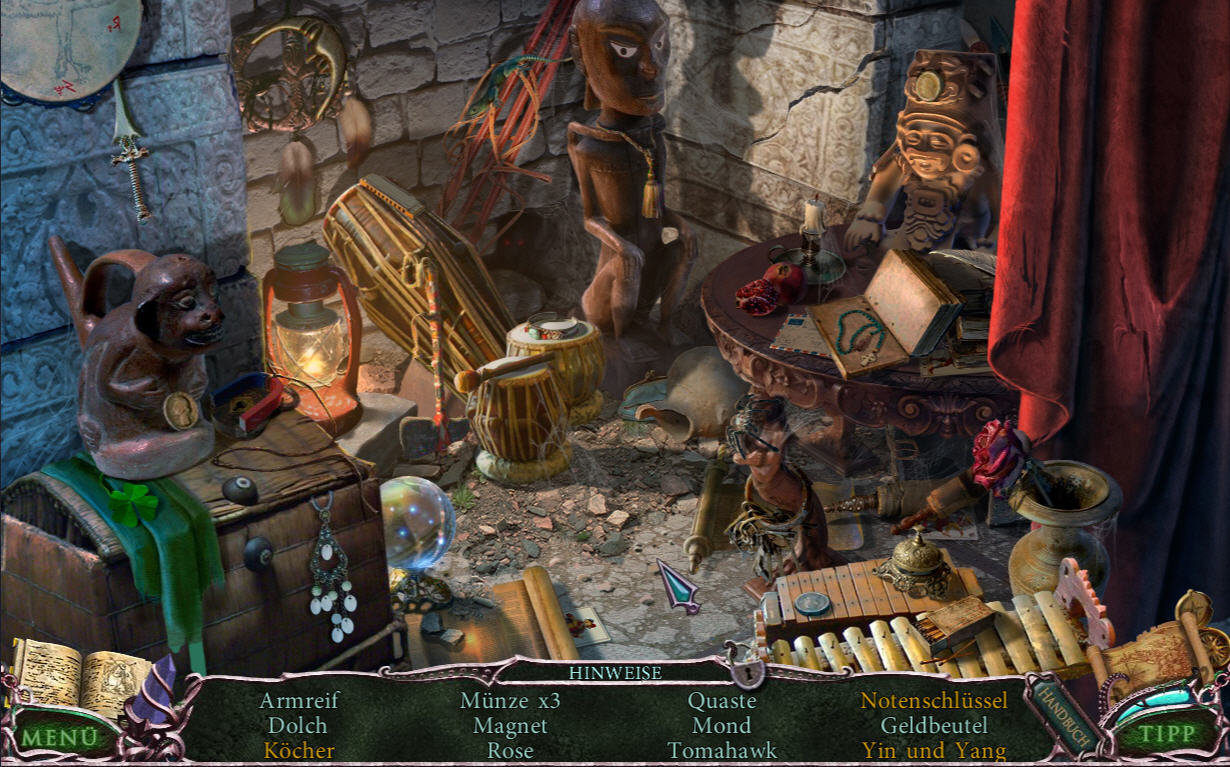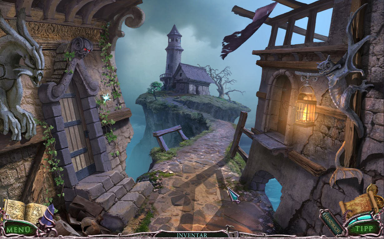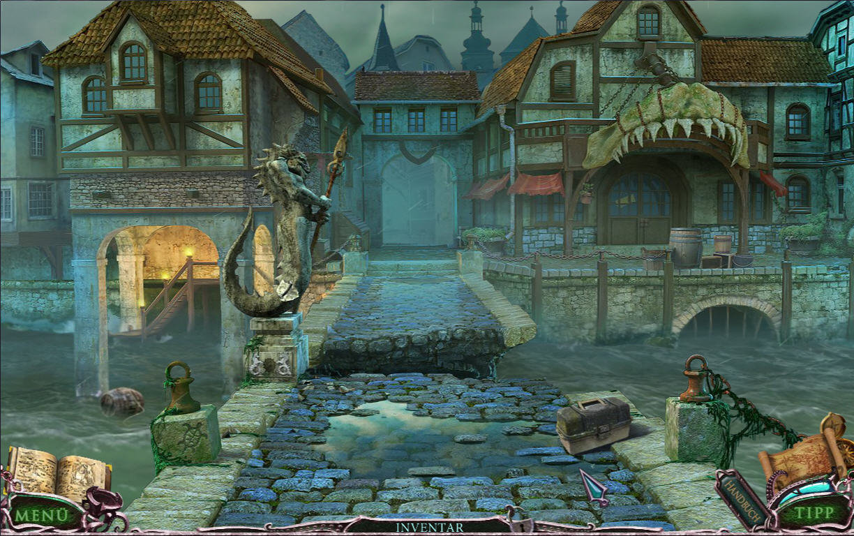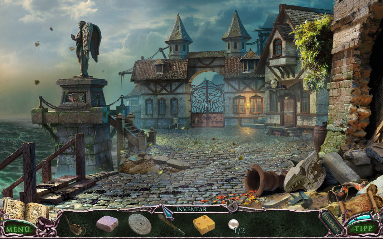 Der Fluch des schwarzen Wassers lässt sich in drei Modi spielen – einfach, mittel, schwer. Es gibt keine Karte, aber ein Notizbuch, in dem alle Infos, die man im Laufe des Spiels sammelt, festgehalten werden. Außerdem gibt es einen Tipp-Button. Dieser lädt sich im einfachen Modus sehr schnell auf. Interaktive Bereiche funkeln auf, aber leider sagt der Tippknopf nicht, WO etwas zu machen ist … lediglich ein „Hier ist nichts mehr zu tun“ … Toll, denn bei diesem Spiel muss man echt viel umher laufen. Dann gibt es einen Gegenstand an diesem Ort, um ihn dann am anderen Ort wieder zu benutzen. Das ist schon ein großer Knackpunkt, denn ich hab mich ein paarmal dabei erwischt, dass ich mit Sammelwerken (drei Gegenstände von der gleichen Sorte) gar nicht mehr wusste, wo ich hin musste. Dann rennt man nämlich noch mehr durch die Gegend. Nunja.