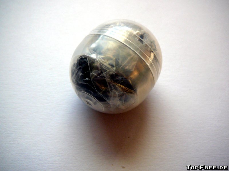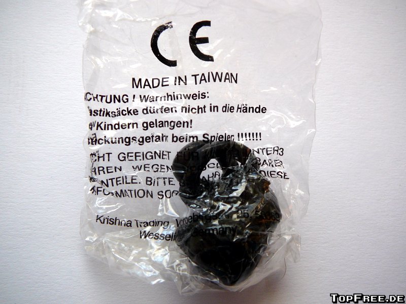 Die Kapsel in der Größe K11 war ziemlich nass, der Metallgerucht des Münzprüfers klebte mir an den Fingern. Es regnete. Ein wenig enttäuscht war ich, als ich durch die Kapsel schon die schwarze Farbe schimmern sah. Einen schwarzen Schleimi wollte ich am wenigsten haben. Auf die Kapsel gedrückt kam schon die Plastikverpackung mit der Aufschrift „MADE IN TAIWAN“ zum Vorschein. Oha. Angefasst fühlt sich das Zeug noch immer so ekelig wie damals an. Woraus diese bestehen? Schwer zu sagen, ich weiß es ehrlich gesagt nicht und habe auch nichts darüber gefunden – falls es einer weiß, kann er ja mal in die Kommentare schreiben.