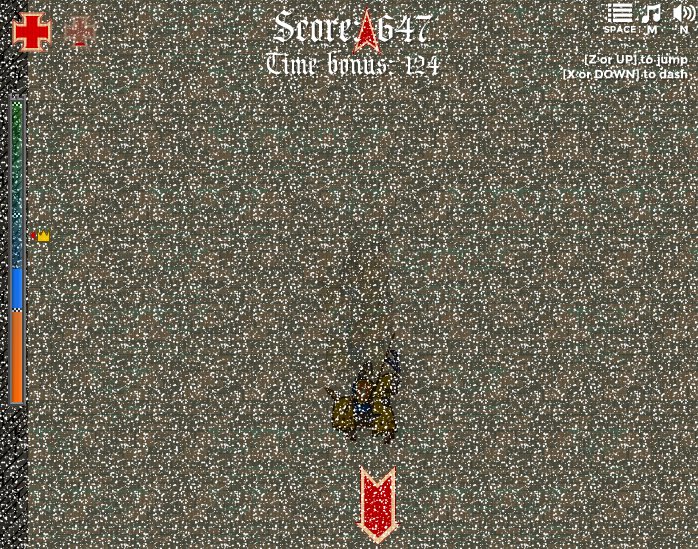 Als edler Ritter ist man mit Pferd in einen tiefen Turm gefallen und schwimmt erstmal durch die Kanalisation. Nachdem das Pferdchen, samt Reiter, rausgehüpft ist, geht es schon los. Wie der Reiter und das Pferd im Wasser Luft bekommen haben, ist nicht überliefert worden. Mit den Pfeiltasten steuert man den Gaul. Nach unten gedrückt setzt man zum kurzen Sprint an. Recht witzig ist, dass man teilweise nicht mehr wirklich viel sieht, denn Regen, Schnee und Dunkelheit vernebeln einem die Sicht. Es schneit im Turm? Okay! Dazu gibt es noch Münzen und Extras zum Einsammeln bei der Hüpferei nach oben, bei der einige Plattformen mehr als wackelig sind. Die Wände kann man übrigens auch zum Springen nutzen.