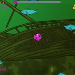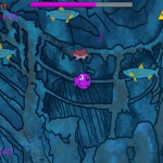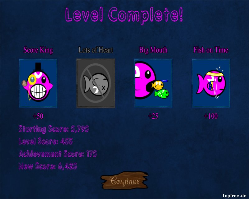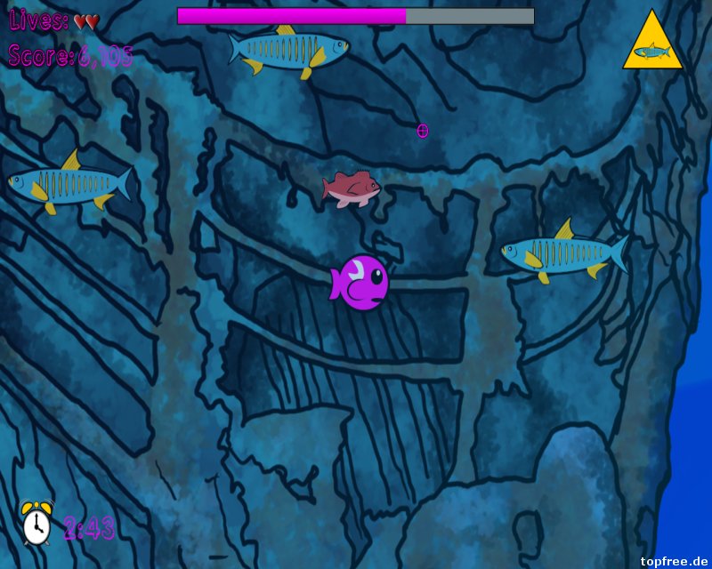 Gesteuert wird Noms mit der Maus. Denn mit den Pfeiltasten und gar WASD bewegt sich das lila Monster nicht vom Fleck. Dafür muss allerdings die linke Maustaste dauerhaft gehalten werden. Noms folgt dann dem Fadenkreuz, desto weiter weg vom Fisch, desto schneller bewegt er sich fort. Zu Beginn eines jeden Levels und im Level rechts oben wird einem der Fisch angezeigt, den man nicht fressen sollte, bzw. dem man sich nicht nähern sollte. Denn berührt man diesen, verliert man ein Herz. Der Rest wird gefressen, gnadenlos. Dabei läuft die Nahrungsaufnahme relativ unspektakulär ab. Fisch berühren, weg isser. Zumal diese einfach nur stupide von links nach rechts oder umgekehrt schwimmen. Besondere Animationen gibt es keine, obwohl doch. Noms folgt mit seinem Auge der Mausbewegung und öffnet beim Fressen sogar das Maul. Etwas Abwechslung bieten die Luftblasen, die von unten nach oben aufsteigen und in denen ab und zu Extras versteckt sind. Zweifachpunkte, Herzen oder ein Schutzschild, mit dem Noms dann auch die „größeren“ verspeisen kann. „Größer“ ist hier relativ, denn im Laufe der Levels sind die Fische sowieso größer als der süße lila Fisch selbst.