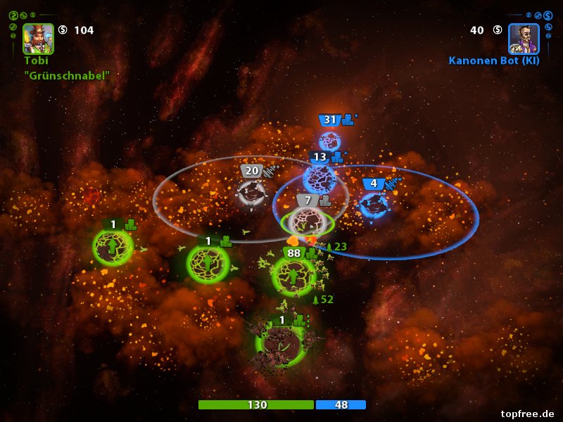 In der Kampagne gibt es 32 Missionen, 15 freischaltbare Technologien und drei Schwierigkeitsgrade. Das Ziel ist es immer, die gegnerischen Planeten vollständig zu übernehmen. Hierbei gewinnt der, mit den meisten Raumflotten. Übernommene Planeten können wahlweise in den Defensiv- oder Offensivmodus gestellt und ausgebaut werden. Was in den ersten Missionen noch recht einfach ist, wird nach und nach immer schwieriger. Der Angriff erfolgt per Mausklick und klappt nicht immer so optimal wie gewünscht. Optional kann mit einem Xbox 360-Controller gespielt werden. Neben der Kampagne gibt es einen Skirmish-Modus, für Gefechtschlachten für zwischendurch. Für zwischendurch ist auch das ganze Spiel sehr gut geeignet, denn trotz der einfachen und leicht zu erlernenden Steuerung hat das Spiel Tiefgang und natürlich Spielspaß. Im Multiplayer kann wahlweise off- oder online gespielt werden. Wobei für den Offlinemodus ein Gamepad angeschlossen sein muss. Im Onlinemutliplayer gibt es leider so gut wie gar keine Gegner, hier müsste man sich schon speziell für verabreden.