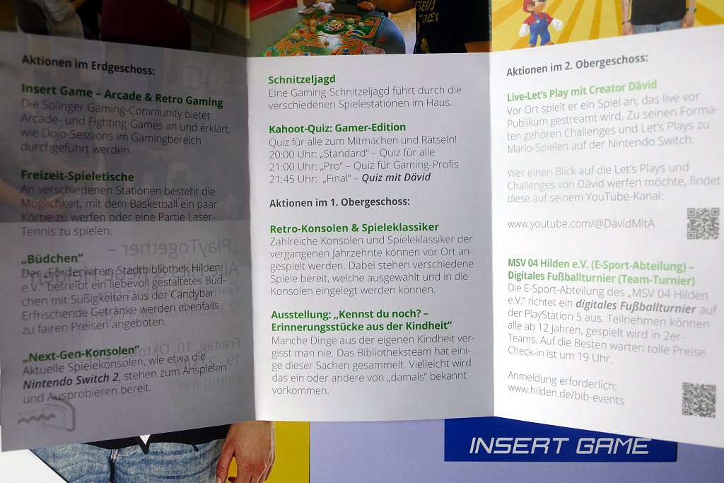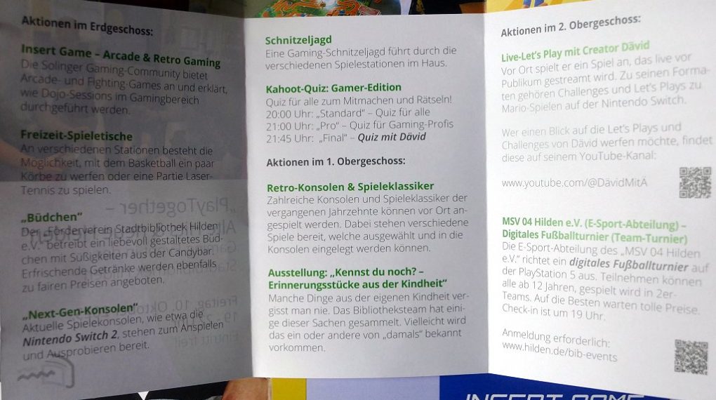 Als weitere Aktion führt eine „Gaming-Schnitzeljagd“ quer durch die verschiedenen Spielestationen im Haus. Für das leibliche Wohl sorgt der „Förderverein Stadtbibliothek Hilden e.V.“. An einem liebevoll gestalteten „Büdchen“ gibt es Getränke und Süßigkeiten aus der Candybar zu fairen Preisen.