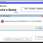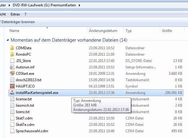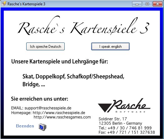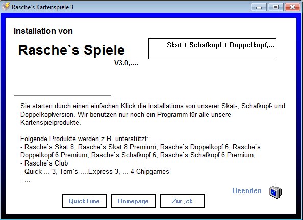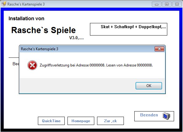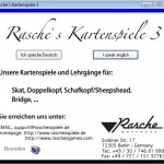 Aber kommen wir zur eigentlichen Installation. Unter Windows 7 läuft diese nicht ganz reibungslos ab. Erst soll, nach dem Autostart, ausgewählt werden, ob man Deutsch oder Englisch spricht. Danach erscheint das nächste Fenster von „Rasche`s Spiele V3.0,….“. Das alles sieht sehr altbacken aus, der Zurück-Button ist noch nicht mals richtig dargestellt. Allerdings passiert auch nichts, wenn ich rechts oben auf „Skat + Schafkopf + Doppelkopf,…“ klicke. Stattdessen lädt der PC unheimlich lange und irgendwann erscheint eine Fehlermeldung, selbst beim Drücken auf die Beenden-Schaltfläche. Ich empfehle hier direkt die Datei „installRasKartenspiele4.exe“ von der CD-Rom zu starten. Zwar dauert es auch hier unheimlich lange, bis endlich mal etwas passiert, doch damit lässt sich die Kartenspiele-Box direkt installieren.