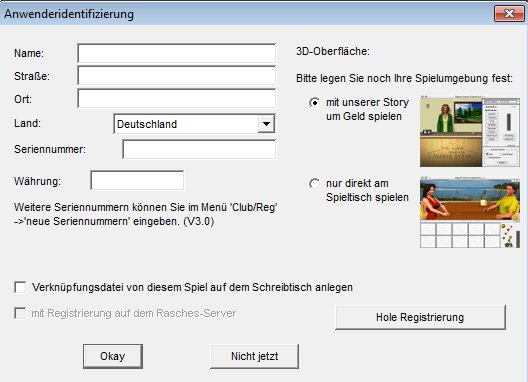 Ist diese Hürde überwunden, folgt die „Anwenderidentifizierung“. Hier soll ich Name, Straße, Ort, Land, Seriennummer und eine Währung eingeben. Zudem noch, ob ich „mit unserer Story um Geld spielen“ oder „nur direkt am Spieltisch spielen“ möchte. Hä? Ich habe das Spiel als Boxed-Version, die im Laden erhältlich ist, gekauft und eine Seriennummer. Ich möchte diese einfach nur eingeben und loslegen! Meine Adresse gibt’s schon mal nicht, muss aber alles ausgefüllt werden. Währung lasse ich ganz frei. Die Seriennummer liegt auf dem Infozettel bei. Für jedes Spiel eine, zunächst kann aber auch nur eine einzige eingegeben werden.