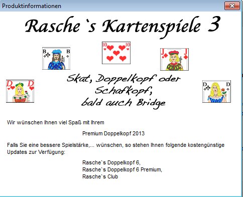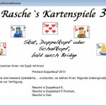 Fazit: Die Premium Kartenspiele-Box von Rasche-Softwareentwicklung bietet die Spielvarianten Skat, Doppelkopf und Schafkopf in altbackener Optik mit allen möglichen Einstellungen, wenn man sie denn findet. Für Gelegenheitsspieler, die einfach mal eine Runde Karten spielen wollen, ist die Sammlung in gewisser Weise zu umständlich zu handhaben. Für Kartenspielfreunde, die keinen Wert auf eine aktuelle Grafik legen und von den technischen Macken absehen können, bestimmt einen Blick wert. Ich als Anfänger, hatte aber keine Lust, alles durchzuarbeiten. Da setze ich mich lieber mit ein paar Freunden zusammen und lasse mir die Regeln „in echt“ erklären. Hinzu kommt die umständliche Seriennummern-Eingabe und Tatsache, dass ich gar nicht weiß, ob ich nun eine Clubmitgliedschaft, und wenn ja wie lange, habe oder nicht … und wofür diese überhaupt gut ist. Die Box-Version bietet dazu nämlich keinerlei ausreichende Hinweise.