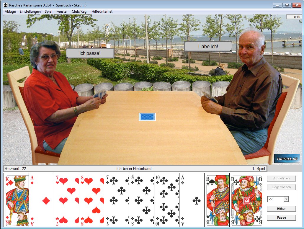 Ich bin drin! Und sehe…eine Oma und einem Opa am Spieltisch! Hmm. In der Tat konnte ich mir ein breites Grinsen nicht verkneifen, wassen dit? Irgenwie sieht alles recht altmodisch und unübersichtlich aus. Zumindest für mich als Kartenspiel-Laie. Skat kann ich ja, oder eher, konnte es mal, aber die anderen Varianten wollte ich eigentlich durch das Spiel lernen.