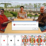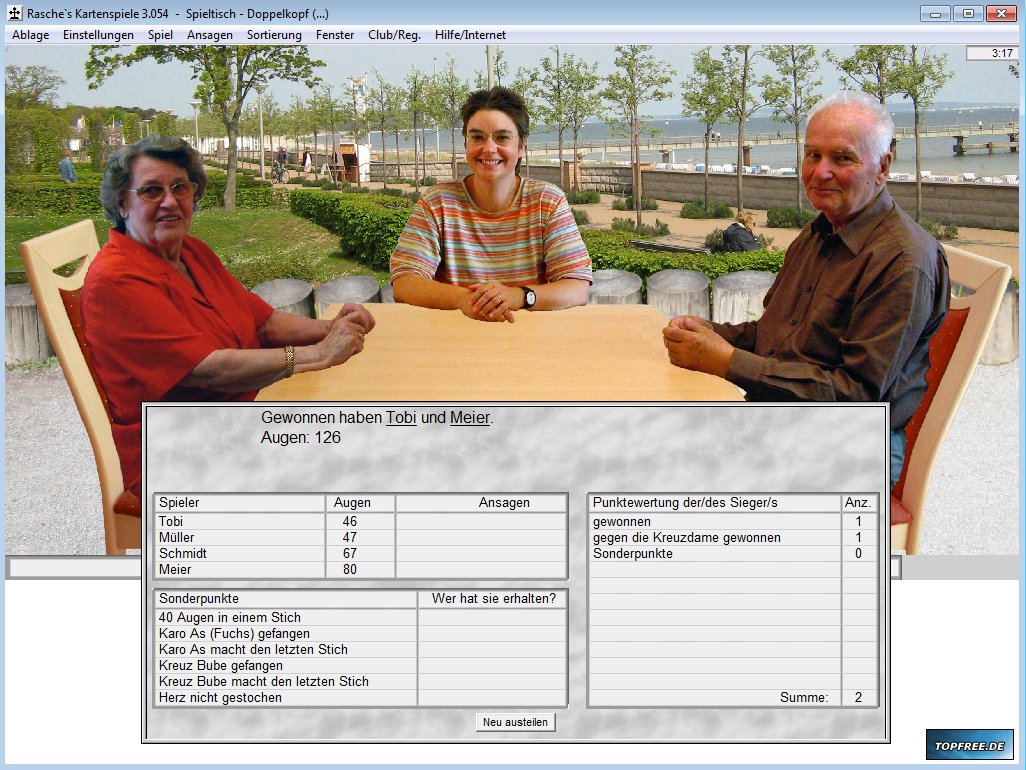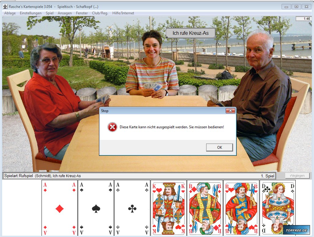 Also über den Reiter „Club/Reg.“ kann eine „Neue Seriennummer…“ eingegeben werden. Gibt man hier die anderen ein, kann man auch die anderen Kartenspiele spielen. Auswählbar sind diese über „Einstellungen“ -> „Kartenspiele…“. Dann geht’s irgendwie los. Eine falsche Karte wird durch eine übliche Windowsfehlermeldung mit entsprechend bekanntem Klang ausgegeben. Ansonsten gibt es überhaupt keinen Ton, geschweige denn eine Hintergrundmusik. Unter „Ablage“ -> „kommentiere Beispiele…“ gibt es für Anfänger, neben der Hilfe-Datei, u.a. auch über „Hilfe/Internet“ erreichbar, zumindest eine Spielerklärung. Bei meinem Doppekopf-Testspiel habe ich sogar auf Anhieb gewonnen, mit Meier zusammen. Wer ist eigentlich dieser Herr Meier? Und warum glotzen die mich die ganze Zeit alle so an, anstatt auf ihre Karten zu gucken? Meine Karten liegen auch noch offen auf dem Tisch! Nicht schummeln!