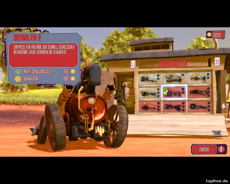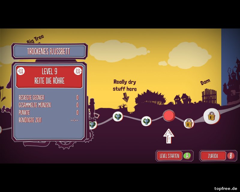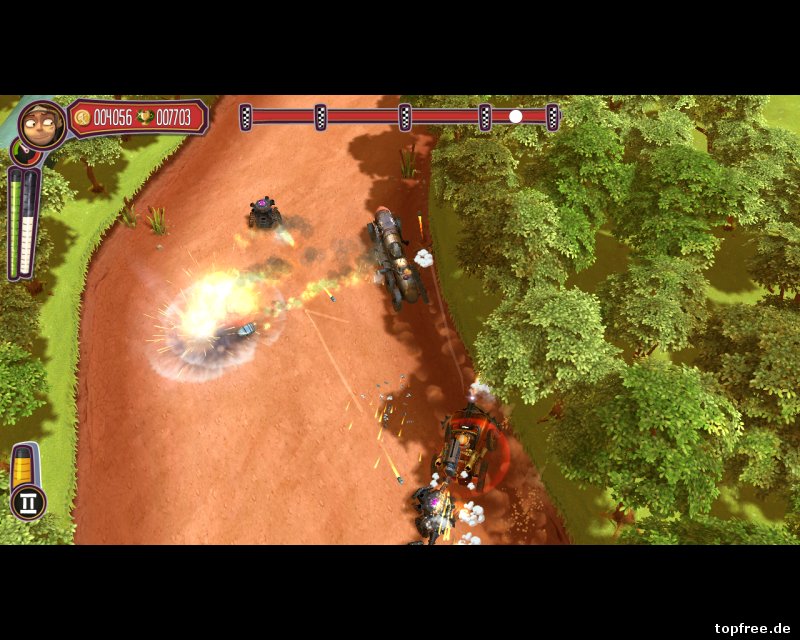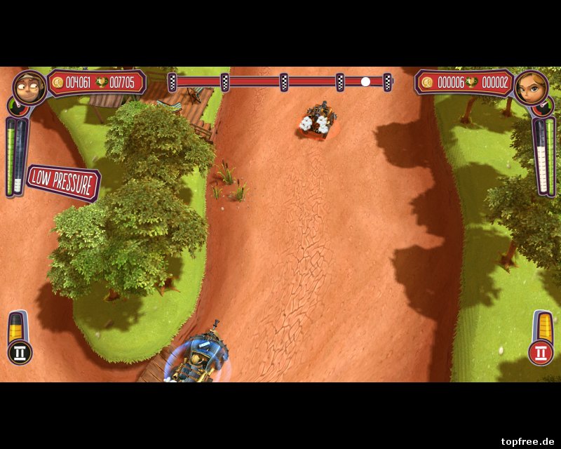 Für die Steuerung des Steambuggy sind nur wenige Tasten vonnöten. Gas geben, links-rechts, rückwärts. Feuer frei, Boost, sowie die zweite Feuertaste für die extra gekaufte Waffe. Anfangs steuert sich der Buggy aus der Vogelperspektive etwas ungewohnt. Denn die Steuerung reagiert ziemlich gut, das soviel heisst wie: Ein Druck nach links geht auch sofort nach links. Nach einer kleinen Gewöhnungszeit hat man die Steuerung aber inne und kann dem Wagen freien Lauf lassen. Ebenso wie dem Feuer, denn die Waffe kann sollte eigentlich im Dauerfeuer gedrückt gehalten werden. Rattatatatata und mit Vollspeed durch das Level! Die Gegner kommen zumeist von hinten angesaust und versuchen dich abzuschießen oder sogar dein Pressure zu klauen. Immer darauf achten, genug Gegner aus dem Weg zu ballern, damit das Pressure nicht komplett aufgebraucht wird. Im oberen Bildschirmrand der On-Top Perspektive wird die aktuelle Position im Level angezeigt. Jeweils an drei Checkpoints wird das Pressure wieder aufgefüllt. Ist es komplett leer, ist das Level beendet. Boosten und Schießen zieht nichts davon ab, also kann nach einfach drauf los geschossen werden.