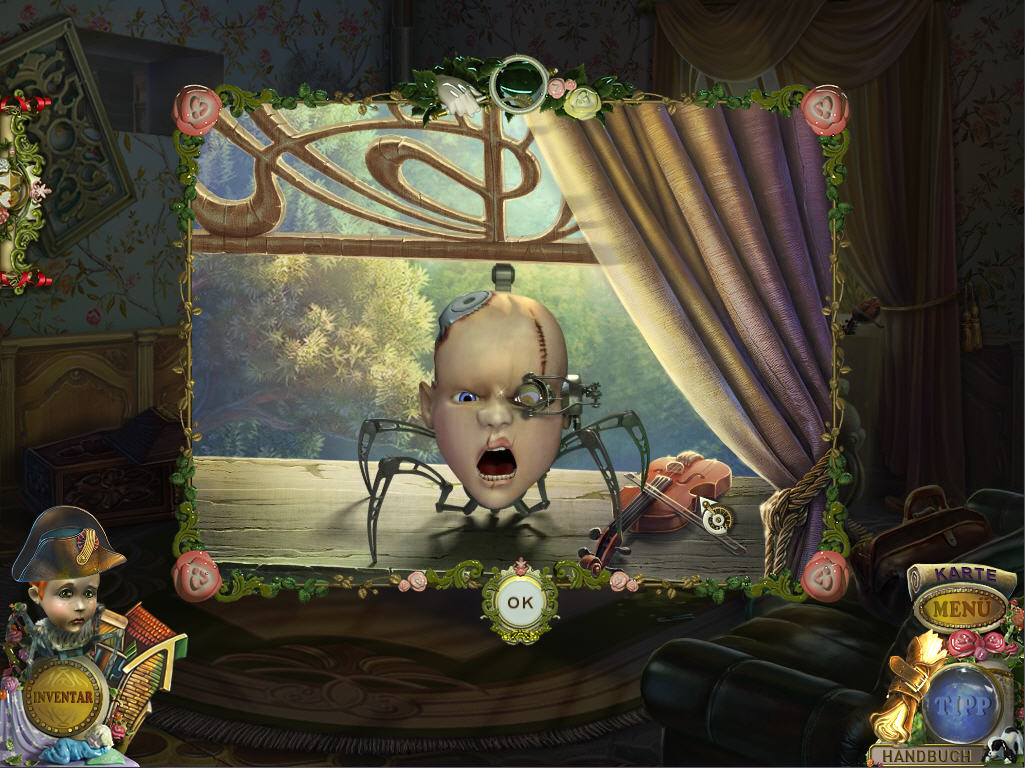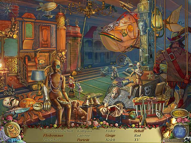 Am Anfang bekommt der Spiele eine kleine mechanische Puppe zur Hilfe, der man sogar einen Namen geben kann. Die Wimmelbildszenen spielt man jeweils zweimal und beinhalten Gegenstände, die man in die Szene einsetzen muss, um eins zu erhalten. Die Inventarliste ist in Form eines Fächers gestaltet worden. Finde ich ziemlich nervig! Gelangt man weiter ins Spiel, gibt es Wortsuchlisten als Wimmelbildspiele. Karte und Tipp sind oft nutzlos. Die Minigames größtenteils easy.