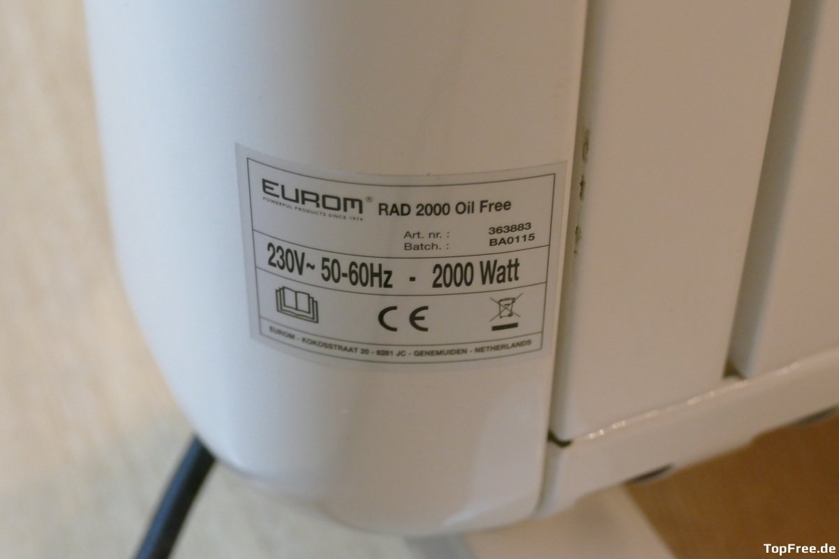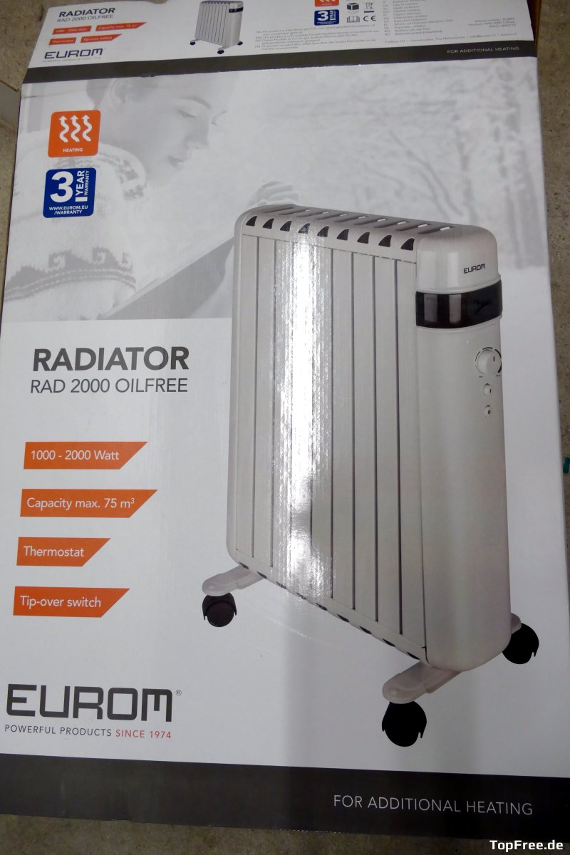 Der RAD 2000 Oilfree, also der ölfreie Heizkörper, von Eurom ist recht kostengünstig (60-70 Euro) und macht was er soll. Er heizt kleinere Räume von 20 (gut) bis vielleicht höchstens 30 m² auf (Herstellerangabe: 75 m³). Der Radiator, unter dessen Bezeichnung er geführt wird, ist allerdings eher ein Konvektor. Er gibt die Wärme fast ausschließlich nach oben ab. Für kurzfristige Einsatzwecke meiner Meinung nach gut geeignet, allerdings auch kostenintensiv im Betrieb. Da die Wärme im Gegensatz zu Ölradiatoren weder gehalten wird, noch an die Seiten abgegeben wird, muss dieser länger im Betrieb sein, um kleinere Räume aufzuheizen. Dafür ist er umweltfreundlicher, da Ölradiator irgendwann beim Wertstoffhof oder bei Recyclingstationen entsorgt werden müssen. Zudem sollen ölfreie Heizungen langlebiger sein. Mir persönlich hat der RAD 2000 bisher gute Dienste erwiesen, er ist geräuschlos und komplett ohne Ventilator, leicht und ich konnte bei einem Heizungsausfall im Winter eine 1-Zimmer-Wohnung damit warm halten.