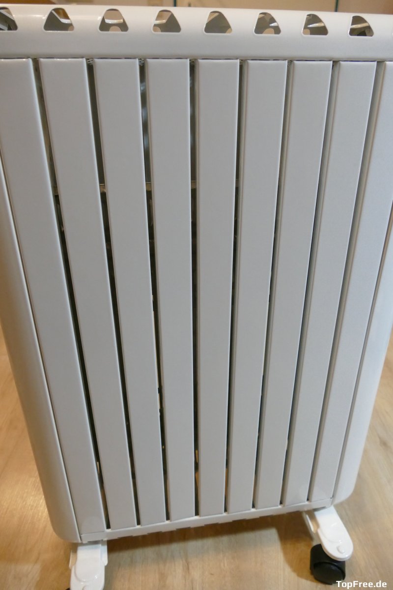 Die Einstellungen vorzunehmen sind durch die Bedienelemente sehr einfach. Es gibt ja eben nur zwei Knöpfe und einen Drehschalter. Allerdings muss man selbst ausprobieren, welche Einstellung für welche Räume am besten geeignet ist. Rund 20m² lassen sich bei Temperaturen draußen mit einem Knopf (1000 Watt) gut warmhalten. Zum schnelleren Aufheizen würde ich aber zwei Knöpfe (2000 Watt) empfehlen. Was auffällt ist, dass der Heizkörper nur oben heiß wird und unten kalt bleibt, bei einem eingeschalteten Knopf. Sind beide eingedrückt wird es unten lauwarm bis warm, je nach Einstellung des Reglers, und oben weiterhin heiß(er). Beim Praxistest aufgefallen und nicht in der knappen Anleitung erläutert: Knopf 1 gedrückt, es wird nur oben heiß. Nur Knopf 2 gedrückt: Es wird unten lauwarm und oben heißer. Man schaltet mit dem ersten Schalter die oberen Heizelemente an und mit dem zweiten die unteren. Warum wird es dann trotzdem nur oben warm? Auf Nachfrage sagt der Hersteller dazu: „Das ist ganz normal, das hat auch damit zu tun, dass warme Luft immer nach oben wandert.“ Übrigens. Beim WiFi-Modell wird dies im Handbuch auch so erläutert, hier musste ich dies selber herausfinden. Ebenfalls gibt es dort eine Temperaturangabe für den Regler, der dort von 5 (Min) bis 35 Grad (Max) gehen soll. Ich gehe davon aus, dass aufgrund des gleichen Aufbaus dies hier ebenfalls (theoretisch) so sein soll.