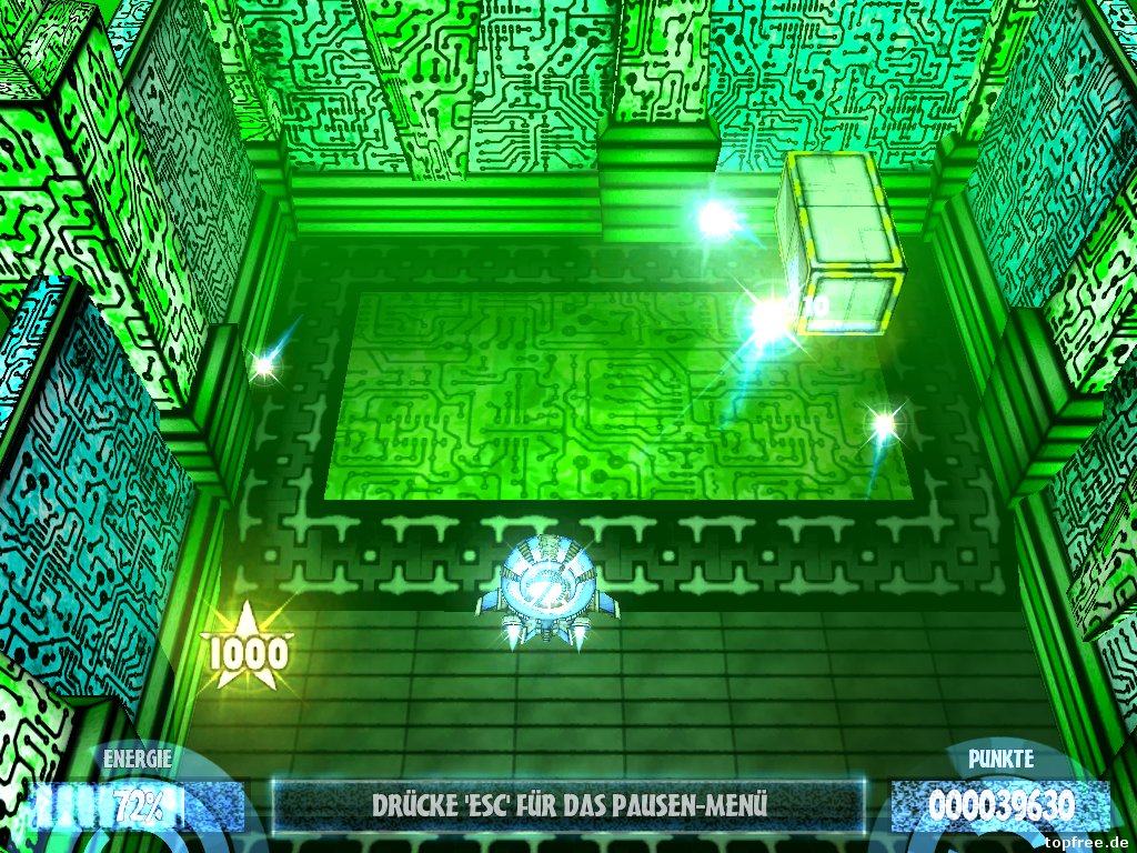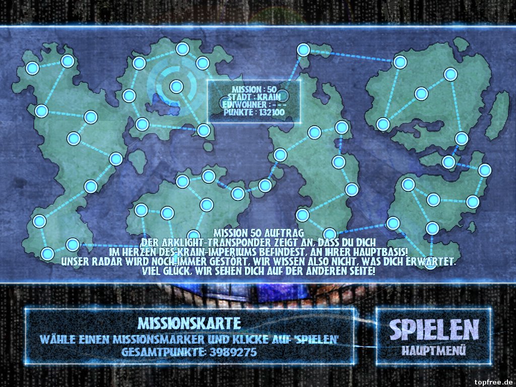 Auf los geht’s los! Das Intro erzählt in einem Video knapp den Storymodus, dann kann auch schon losgeflogen werden. Insgesamt stehen 50 Missionen zur Auswahl, die nach und nach freigeschaltet werden. Der Schwierigkeitsgrad lässt sich jederzeit über das Menü ändern. Das Raumschiff „X52-Arklight“ wird ausschließlich mit der Maus gesteuert. Links, rechts, vor und zurück, sowie die linke und rechte Maustaste sind belegt. Mit der linken Taste werden sogenannte Energiesphären abgeschossen, mit der rechten wieder „reingeholt“. Sprich mit jedem Schuss wird Energie abgezogen, mit der rechten Maustaste werden die Energiesphären wieder angezogen und füllen die Energie auf. Je länger man die linke Maustaste gedrückt hält, desto mehr laden sich die Sphären auf und desto größer werden sie. Stößt man gegen die Wand oder wird von den Gegnern, der „Krain-Armee“, getroffen, wird ebenfalls Energie abgezogen. Bei einem kompletten Energieverlust muss das Level neu gestartet werden und die bisher errungenen Punkte gehen verloren. Besonders hilfreich sind während der Missionen die Power-Ups, die u.a. die Energie auffüllen oder einen Dauerschuss ohne Energieverlust ermöglichen. Ohne die Bonusobjekte wäre manches Level so oder so nich machbar.