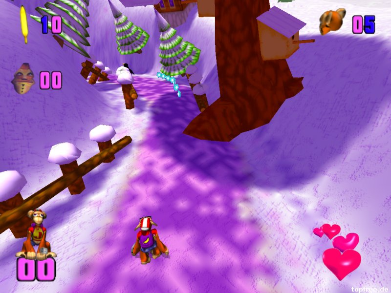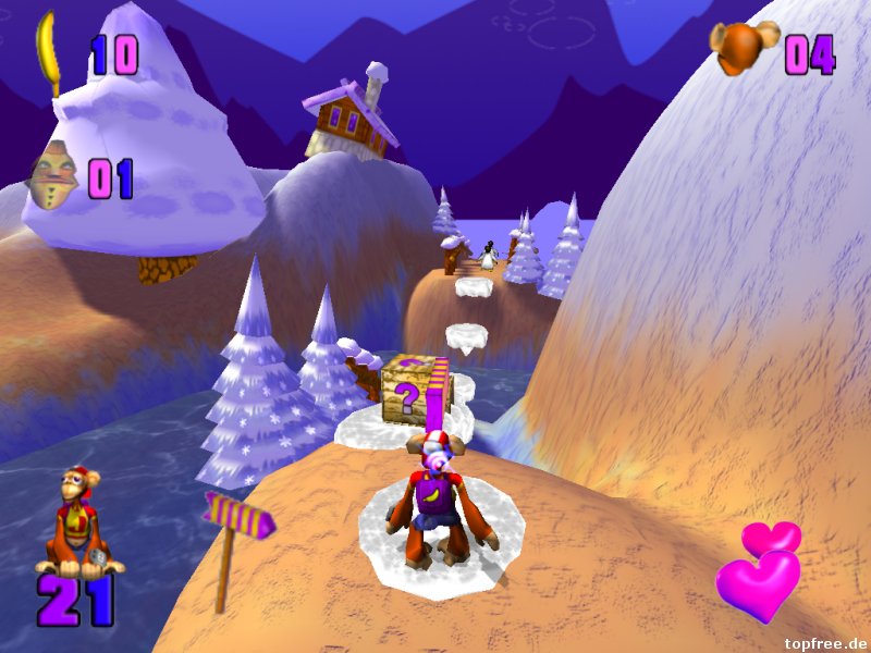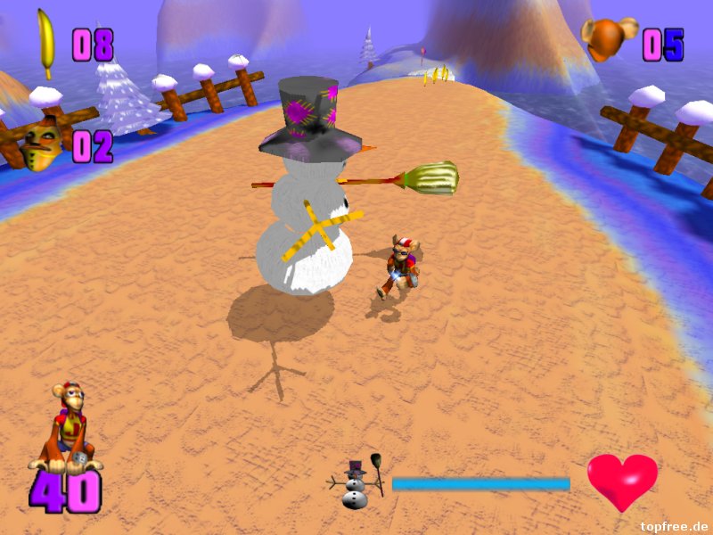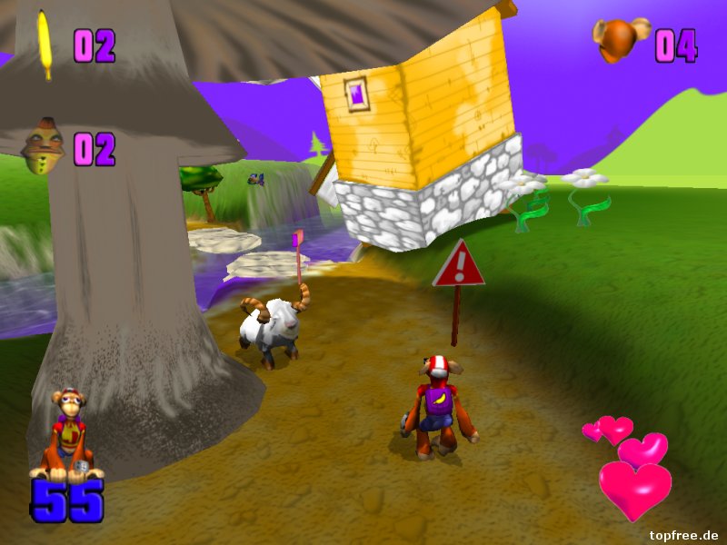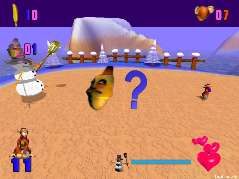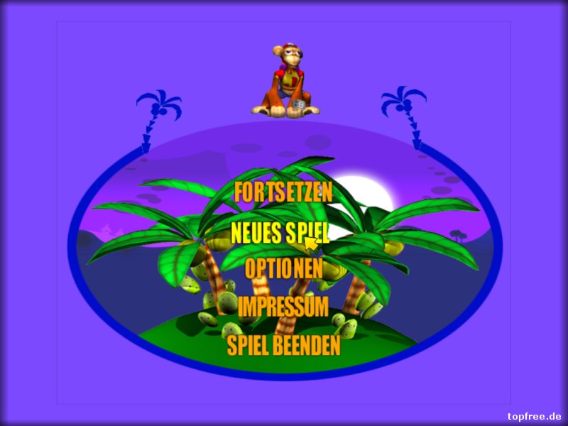 Auch hier gestaltet sich die Installation wieder als schwieriger. Das neue alte Spiel hakt etwas bei der Installation. Beim späteren Spielstart der MonkeyJack.exe bemerkt man sogleich das Alter des Affenspiels. Indiana Jack kann in den Optionen höchstens auf eine Auflösung von 1024×768 gestellt werden, was bei höheren Monitorauflösungen schwarze Balken verursacht. Es kommt ein Retro-Feeling auf. Das Feeling hält auch beim Spielstart an, bei dem zwischen drei verschiedenen Schwierigkeitsgraden gewählt werden kann. Leider gestaltet sich der Ladevorgang bei den zwölf enthaltenden Leveln als schwarzer Wartebereich. Beim ersten Mal dachte ich zunächst an ein: Oh, es läuft doch nicht auf Windows 7? Der Bildschirm blieb komplett schwarz. Nach einiger Zeit erschien dann der Ladebalken und das Spiel startete. Tadaa…Nintendo 64-Grafik lässt grüßen! Die Steuerung erfolgt über die Tastatur, wobei die Tastenbelegung im Optionsmenü frei gewählt werden kann. Neben den Richtungstasten gibt es noch je eine zum Bananen werfen, springen und boxen. Ein Gamepad wird vom Spiel her nicht unterstützt. Wer es trotzdem lieber damit steuern möchte, der kann z.B. auf Xpadder zurückgreifen.