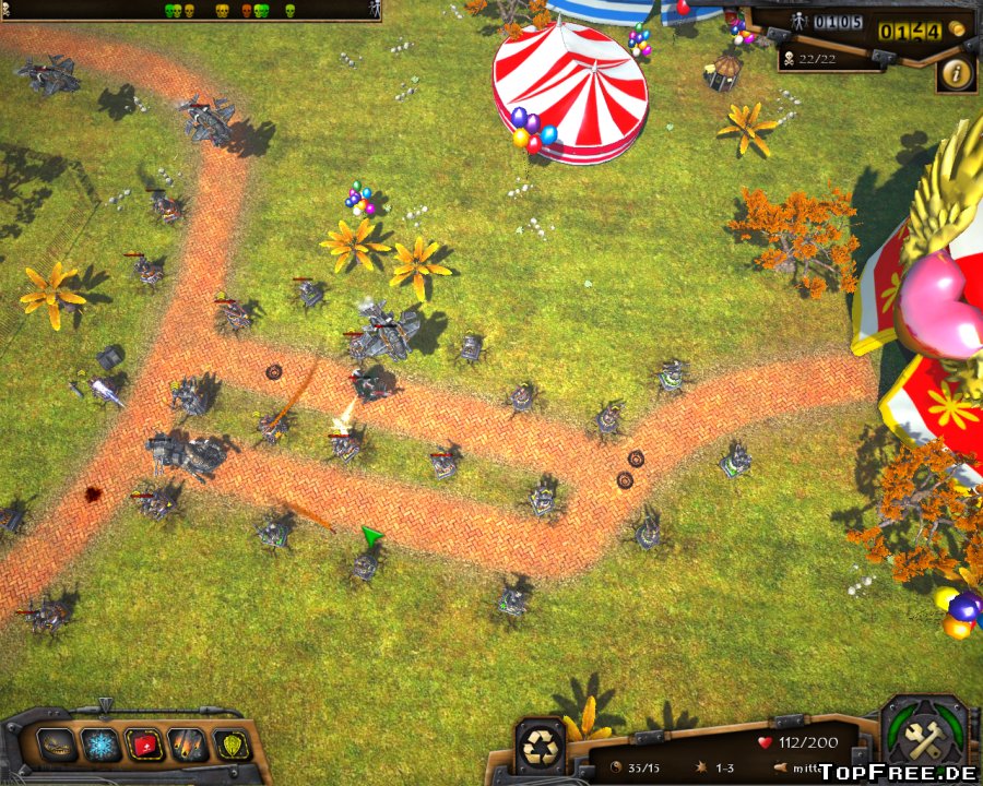 Auch grafisch braucht sich „Rush for Glory“ nicht verstecken. Mittels Mausrad lässt sich zoomen und per Tastatur der Blickwinkel ändern – leider gibt es keine komplette 360-Grad-Drehung. Die beste Übersicht gibt es natürlich von weiter oben, die richtige Schlacht kann von nah angesehen werden. Für ein Tower Defense Spiel dieser Art ist die Grafik sowie vor allem die unterschiedlichen Umgebungen richtig gut! Denn auch das Schlachtfeld ist wunderbar animiert, wenn sich z.B. auf dem Rummeplatz die Karussele drehen und Luftballons im Wind bewegen. Hinzu gesellen sich die schnellen Ladezeiten, auch hier wird der Spielspaß nicht getrübt.