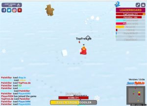 Wie immer wird einfach ein Name und hier auch eine gewünschte Farbe gewählt und schon geht es los. Die Spielfigur befindet sich mitten im Schnee. Dann ist direkt aufpassen angesagt, denn von überall her lauern die Mitspieler. Mit der linken Maustaste wird ein Schneeball geworfen. Drückt man länger, wird der Schneeball umso größer. Drückt man ganz lange, baut man sich einen Eisklotz als Schutzwall. Größere Schneebälle richten natürlich auch einen größeren Schaden beim getroffenen Gegner an. Jeder Spieler hat eine Energieanzeige, ist diese aufgebraucht, muss man neu in das Spiel starten. Ist man selbst getroffen, lädt sich die Leiste wieder langsam auf – sofern man nicht weiter getroffen wird. Schafft man es, einen Gegner KO zu werfen, kann man meist noch Münzen und andere Extras einsammeln, die der Spieler verloren hat. Manchmal sind zudem weitere Extras vorhanden, wie eine bessere Schneekugel oder eine Hasenmaske zur Tarnung. Naja, eher zur Verteidigung. Dazu gibt es immer einen „König“, den Leader des aktuellen Leaderboards, also der Bestenliste – der Beste der Besten sozusagen. Recht witzig ist, wenn ihr einen der herumlaufenden Bären bewerft. Naja, für euch am Ende vielleicht nicht ganz so witzig. Aber ein weiteres nettes Extra, das in das Onlinespiel eingebaut wurde.
