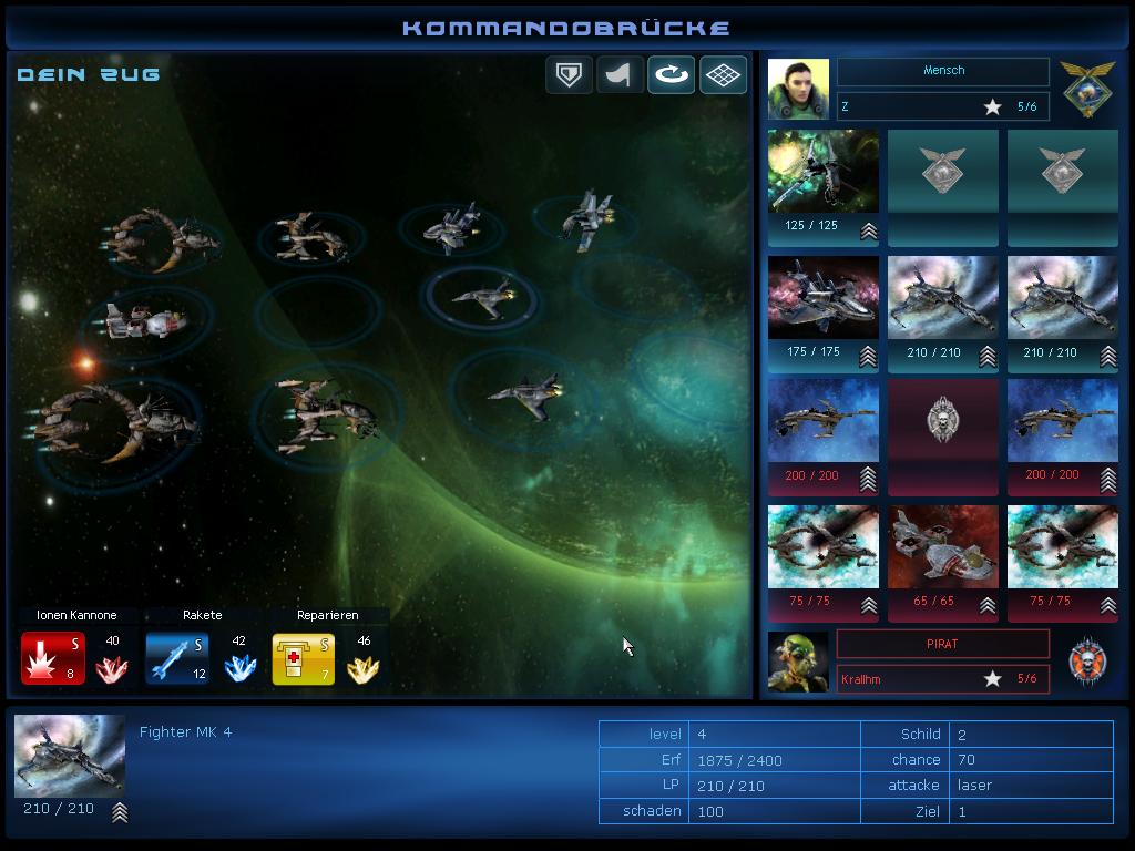 Die Kämpfe sind immer sehr stark vom Zufall abhängig. Der Gegner macht keine taktisch sinnvollen Züge, was fatal wäre, da man meistens gegen eine zahlen- und stärkenmäßige Übermacht kämpft. Das hat leider auch zur Folge, dass man leicht die Schiffe seiner Flotte verlieren kann, falls der Gegner durch Zufall doch einmal „gute“ Züge macht (sprich: die einzig gute Taktik, ein einzelnes Schiff unter Feuer zu nehmen, verwendet). Ein verlorenes Schiff ist augenscheinlich erst einmal kein Problem, da man seine Schiffe kostenlos in Raumstationen ersetzen kann. Jedoch gewinnen die Schiffe in Kämpfen Erfahrung, die sie langsam im Rang aufsteigen und stärker werden lassen. Dies ist unverzichtbar, wenn man das Spiel gewinnen will, denn früher oder später gerät man an einen Punkt, an dem man ohne eine Flotte mit hochrangigen Schiffen nicht mehr gewinnen kann. Man kann die kleinen Schiffe auch nicht an schwächeren Gegnern hoch leveln, da es nur eine fixe Anzahl von Gegnern im Spiel gibt. Sind die erst mal besiegt, sind sie weg. Es ist also leicht möglich, sich in eine Sackgasse zu spielen. Dazu kommt noch ein Fehler im Spiel, der es ermöglicht, ein hochrangiges Schiff durch einen neuen Raumkreuzer zu überschreiben. Dabei gibt es auch keine Sicherheitsabfrage. Wenn man sich einmal verklickt hat man seinen wertvollen Level-5-Jäger durch einen popeligen Level-1-Missile-Cruiser ersetzt. Die Positionen der Raumschiffe in der Flotte können auch nicht nachträglich verändert werden. Wenn man ein Schiff an anderer Position haben will, hat man keine andere Wahl, als es zu ersetzen. Wobei man diese Wahl ja nicht hat, da man auf jede Erfahrungsstufe seiner alten Schiffe angewiesen ist. Meine Taktik war es, aus jedem Kampf zu fliehen, den ich zu verlieren drohte, und zu hoffen, dass ich beim nächsten Mal mehr Glück haben würde. Was daran taktisch sein soll, kann ich leider nicht sagen.