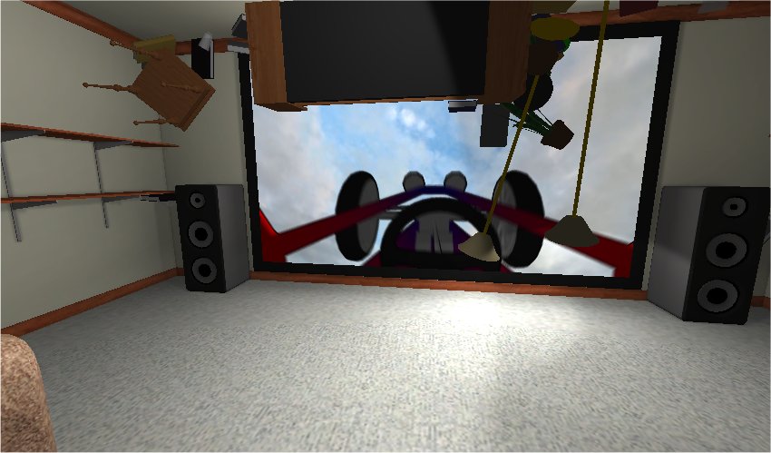 Spielen auf dem Kopf? Nicht ganz, auch wenn der Screenshot es vermuten lassen würde, sitzen wir als Spieler ganz gemütlich auf dem Sofa und zocken. Allerdings fliegt der Rest aus dem Zimmer – bis auf die Stereo-Boxen – wild durch die Gegend. Wie kann das sein? In dem Unity 3D-Onlinespiel können wir uns ganz normal durch das Spielezimmer bewegen, einmal auf das Sofa gehüpft und die Konsole angeschaltet, startet schon „Super RotCER Simulator“ – die etwas andere Rennsimulation…