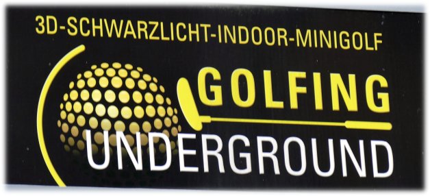 Mingolf in der Halle? Mittlerweile gibt es in vielen Städten das sogenannte Schwarzlicht Minigolf. Vor ein paar Jahren nur in wenigen Städten angeboten, gibt es derweil Bahnen in Berlin, Dortmund, Oldenburg, Nürnberg, Rostock, Wuppertal, … . Letztere genannte Stadt bietet „Golfing Underground“ an. Eben 3D-Schwarzlicht-Minigolf in der Halle. Trotz Dunkelheit erscheint alles bunt, denn mit fluoreszierenden Farben sind die Bahnen und Wände aufwendig gestaltet. Mit einer Spezialbrille kommt ein 3D-Effekt unter den UV-Farben zustande.