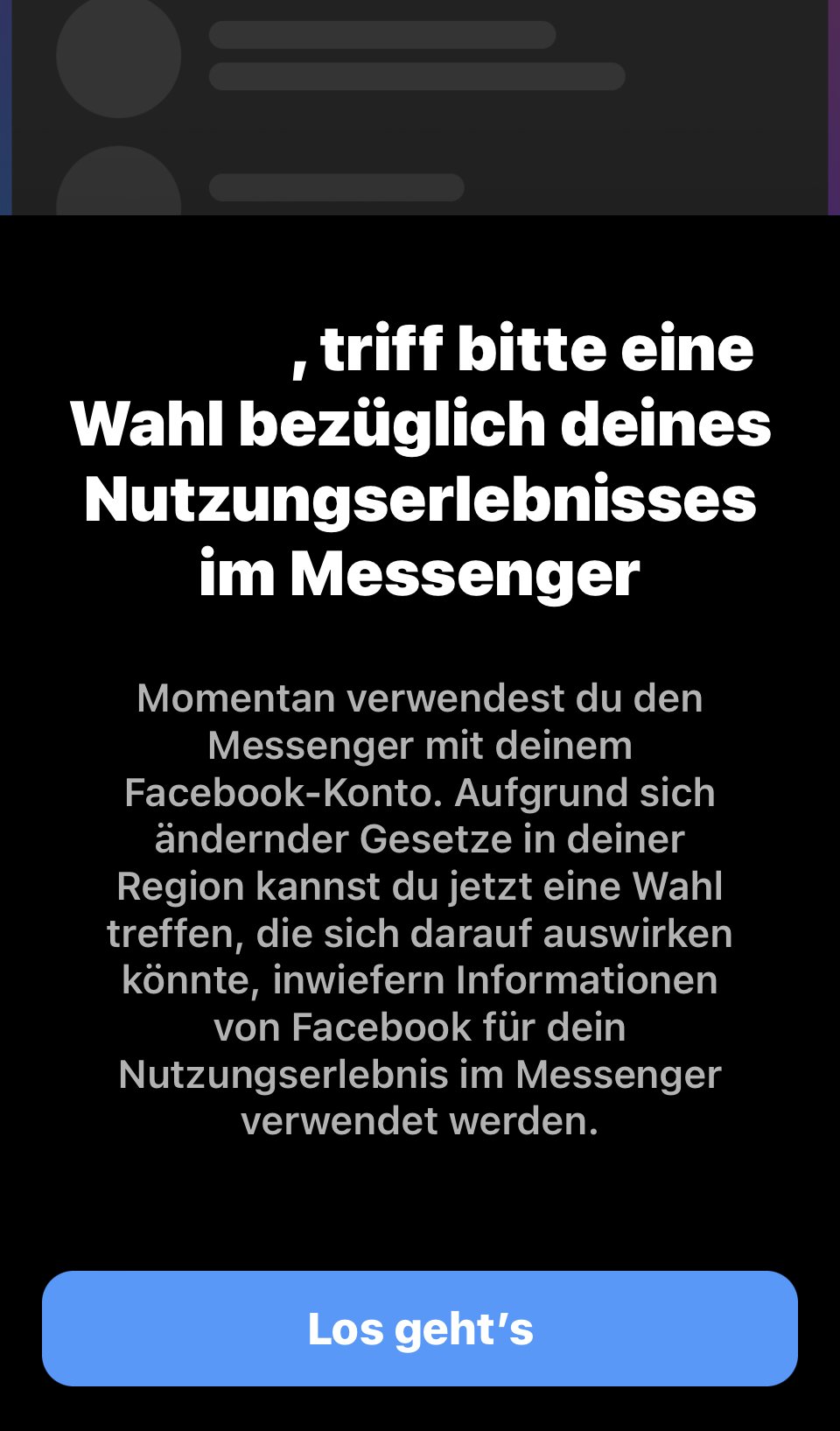 „Momentan verwendest du den Messenger mit deinem Facebook-Konto. Aufgrund sich ändernder Gesetze in deiner Region kannst du jetzt eine Wahl treffen, die sich darauf auswirken könnte, inwiefern Informationen von Facebook für dein Nutzungserlebnis im Messenger verwendet werden.“ Einmal die Zugriffsmöglichkeit für deinen Chatverlauf eingerichtet, kommt die nächste Meldung auf dem Display im Messenger von Meta über Facebook. Was es damit auf sich hat, erfährst du hier.