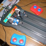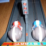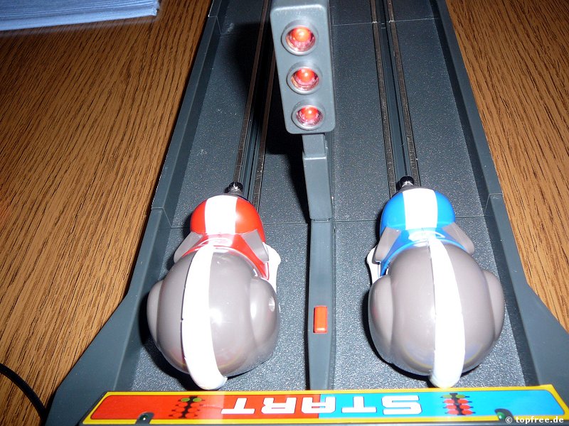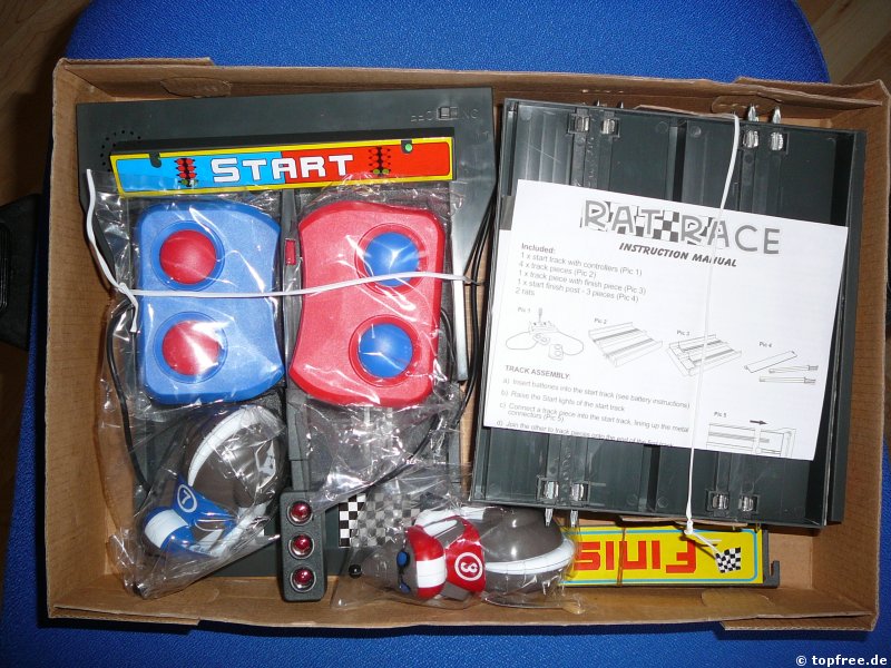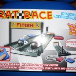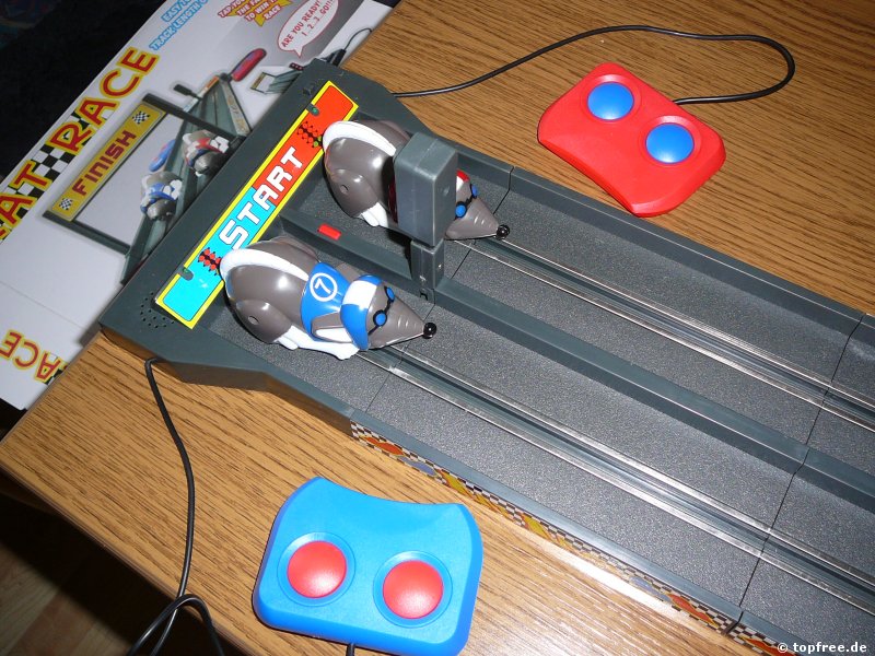 Bei Super Rennspiel / Rennbahn RAT RACE für 2 Spieler, wie es bei Amazon.de gelistet wird, handelt es sich um eine Modifizierung der klassischen Autorennbahn. Anstatt mit Rennautos über eine kurvenreiche Bahn zu flitzen, versucht man hier sich mit Ratten, wahlweise rot oder blau, in das nur ein Meter entfernte Ziel zu drücken. Richtig, zu drücken. Statt einfach den Knopf zum Gas geben zu betätigen, muss man hier zwei Tasten abwechseln drücken. Erinnert sehr an die guten alten Sommer- und Winterspiele, bei denen man abwechselnd auf die Tasten hauen musste und einem nachher die Finger weh taten. Spannend wurde es natürlich erst mit zwei oder mehreren Mitspielern. So kann auch dieses Spiel ausschließlich zu zweit gespielt werden. Denn das einzige Ziel des Spiels ist es, als erster die Ziellinie zu überqueren.