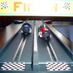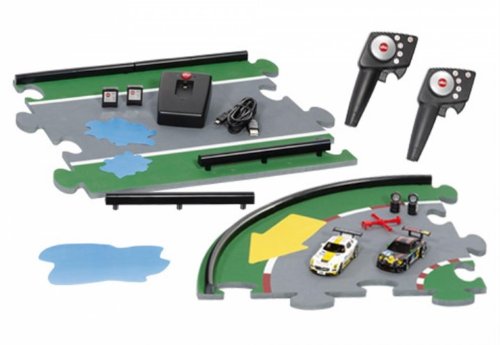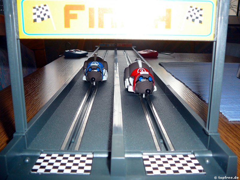 Der Aufbau gestaltet sich denkbar einfach. Die sechs vorhandenen Streckenteile (inkl. Start und Ziel) zusammenstecken, 3xAAA-Batterien in die Startbahn rein … und los geht’s!