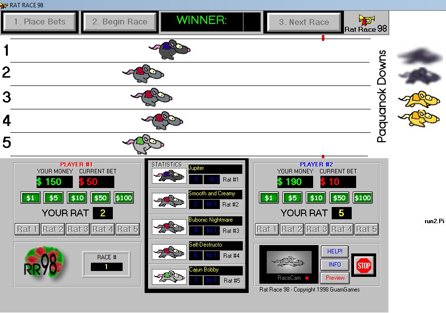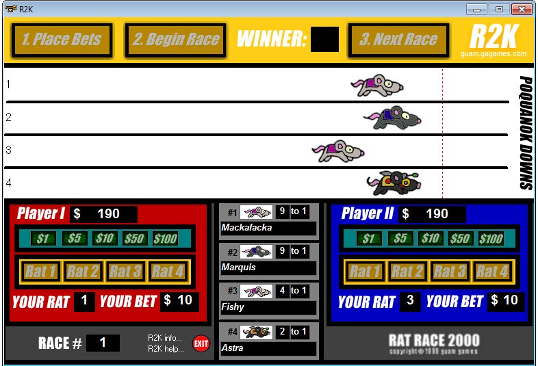 Nicht nur analog, auch digital gibt es das Rat Race Spiel. Hierbei geht es jetzt allerdings darum, auf die richtige Ratte zu setzen, die man selbst nicht steuert. Die Gewinnquote zeigt die Chance der Ratte auf einen Sieg und den Geldgewinn des eingesetzten Betrags (5 to 1 würde den 5-fachen Gewinn des eingesetzten Geldes bedeuten). Mittlerweile schon etwas veraltet, aber immer noch lauffähig und sehr spaßig. Wieder ein Spiel, ausschließlich für zwei Mitspieler an einem PC.