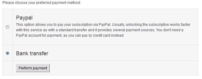 Nach einem Klick auf „Perfom payment“ erscheint ein Überweisungsträger, von dem man ganz einfach den IBAN- und BIC-Code markieren und herauskopieren kann. Beide dann, z.B. per Onlineüberweisung, in das dazugehörige Formular der SEPA-Überweisung einfügen, sowie den Empfänger und den Betrag, fertig. Die SEPA-Überweisungsmethode bringt natürlich keinerlei zusätzliche Kosten mitsich.