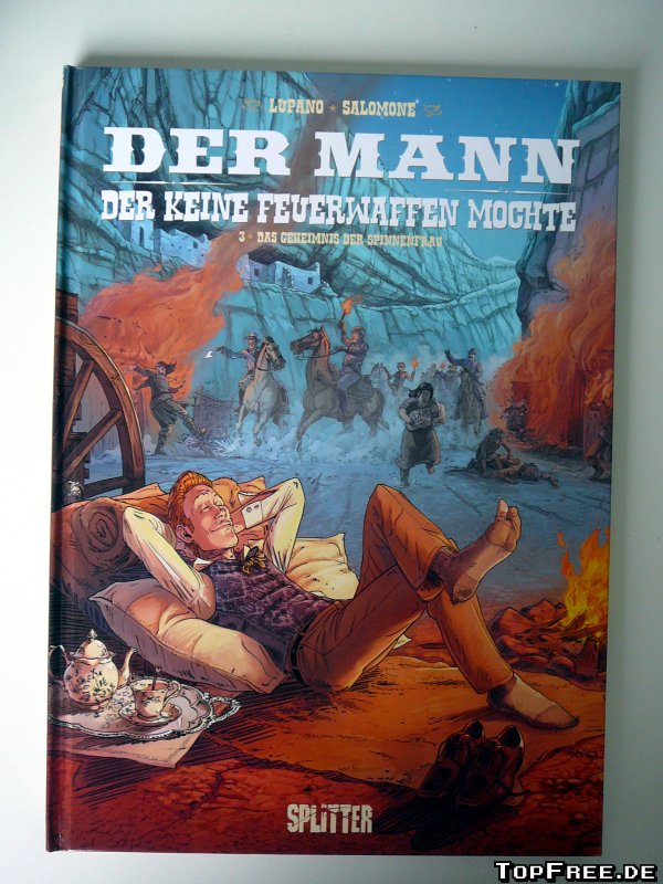 Mittlerweile ist auch der dritte Band des Westerncomicromans erschienen. „Der Mann, der keine Feuerwaffen mochte: Das Geheimnis der Spinnenfrau“ mit Texten von Wilfrid Lupano, Zeichnungen von Paul Salomone und Farben von Simon Champelovier war zu Beginn als letzte Ausgabe geplant, doch es wird schon auf der ersten Inhaltsseite Band 4 „Das Gesetz des Stärkeren“ als Abschlussband angekündigt. Wann dieser erscheint ist noch nicht bekannt, doch jetzt wollen wir uns ja erstmal der neuesten erschienenen Ausgabe widmen…