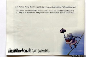 Gedruckt kostet das Werk Studifrosch mit Versandkosten als Büchersendung 4,99 Euro und kann via PayPal bei www.flashfilmchen.de/studifrosch geordert werden. Dort gibt es auch alle Comics online zum Nachlesen.
