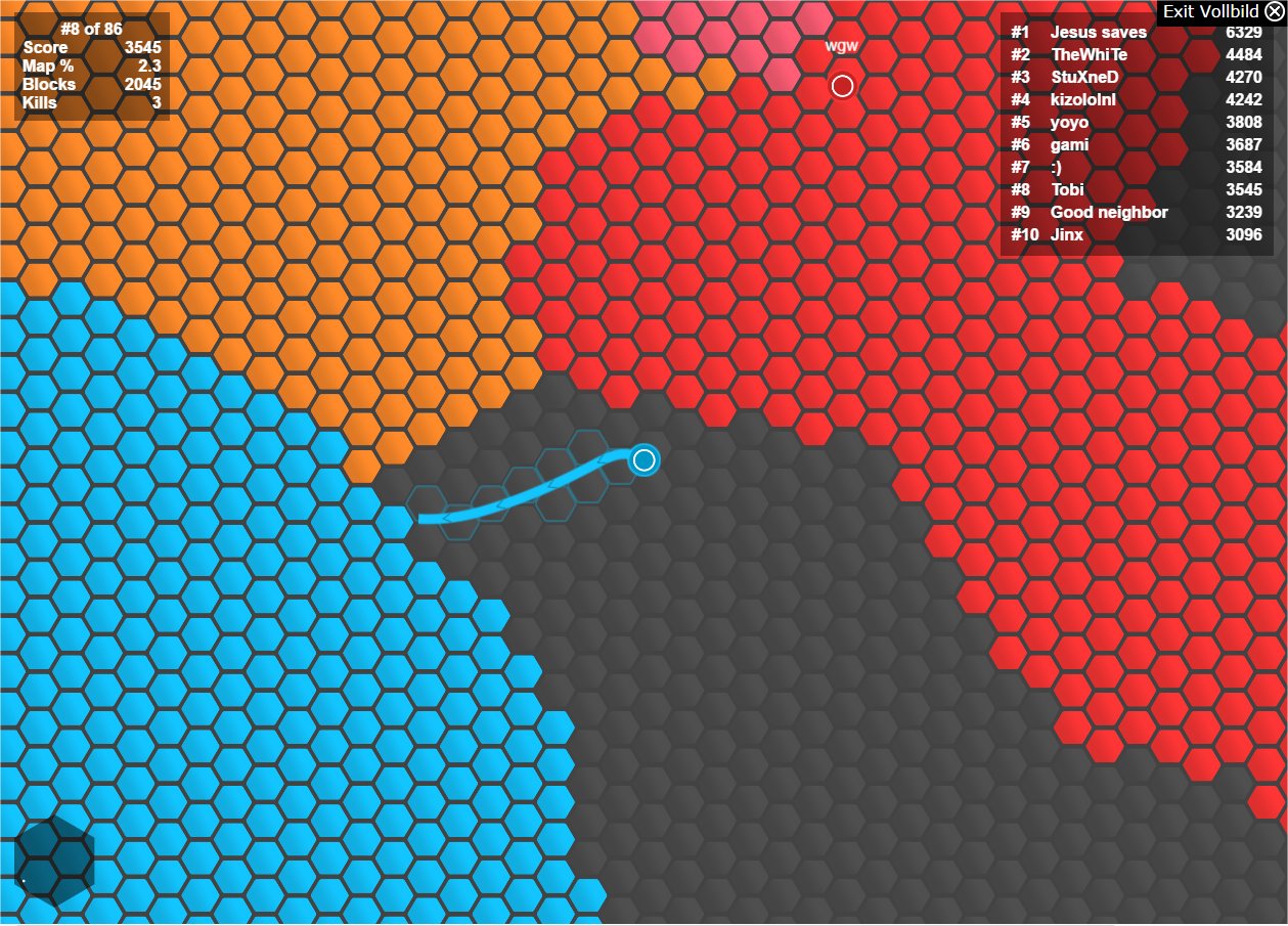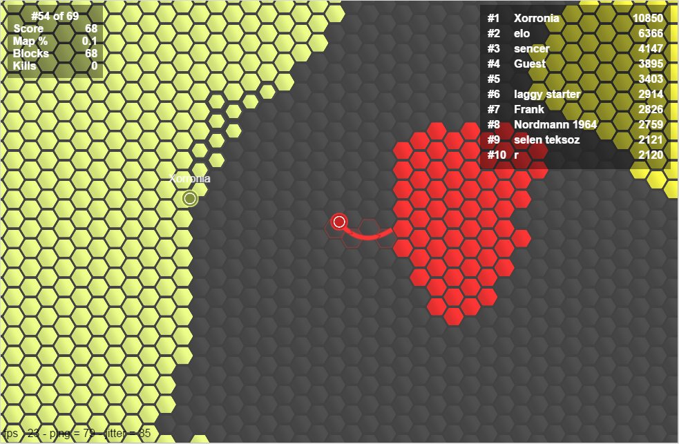 Zunächst wird ein Name gewählt, unter dem man in der Rangliste auftaucht. Dann beginnt direkt das Spiel auf dem in Hexagons eingeteilten Spielfeld. Mit der Maus steuert man seine eigene Farbe. Damit ist man als Spieler ständig in Bewegung und kann nicht einmal kurz pausieren. Das Ziel ist es nun eine Linie zu zeichnen und wieder zurück zu seiner Fläche eine Verbindung zu schaffen. Alles dazwischen wird dann in die eigene Farbe umgewandelt. So versucht man ständig sein eigenes Gebiet zu erweitern und andere Farbflächen zu übermalen. Doch die eigene freie Linie wird auch zur Gefahr. Fährt ein anderer Mitspieler gegen die eigene Linie, verschwindet man und damit die gesamte Fläche. Ein kompletter Neustart ist erforderlich. Sehr ärgerlich, wenn man endlich mal weiter oben in der Rangliste aufgetaucht ist. Ebenfalls sollte man es tunlichst vermeiden sich in den eigenen Schwanz zu beißen …
