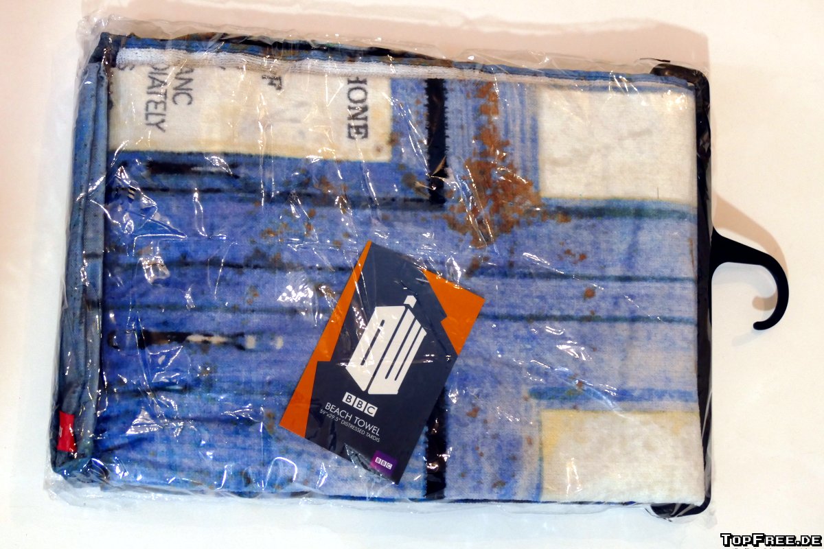 Dann kam mir wieder die Idee: Eine Tardis als Tuch. Als großes Tuch. Doch keine schlechte Idee. Was ist ein großes Tuch? Tardis Bettwäsche? Ein Handtuch? Eher nicht so groß. Ein Badetuch? Ja! Gibt es Badetüchter mit einer TARDIS? Ja! Es gibt sogar verschiedene Bade- bzw. Strandtücher mit diesem Motiv. Eins in der Größe von 140 cm x 70 cm bei und von getDigital. Weitere Motive wiederum bei Amazon.de. Allerdings sollte die TARDIS schon das ganz Badetuch bedecken und keine Ränder oder sontigen spielerischen Motive haben. Am Ende fand ich das Badetuch Tardis Distressed. Sowas wie benutzt oder eher dem Motiv nach zu urteilen beschmutzt. Dennoch sieht es irgendwie cool aus und für eine Tür vielleicht gar nicht so unpassend. Dazu kommt die Größe von 150 cm hoch und 75 cm breit. Also größer als die anderen Badetücher und genau passend, um bis zur Türklinke zu reichen. Klingt schon einmal gut. Dieses Tuch soll zudem recht dünn sein, was als Handtuch zum Abtrocken eher subtopimal wäre, aber für meine Zwecke genau richtig. Ein flauschiges Handtuch wollte ich mir jetzt nicht an die Tür hängen. Gekauft habe ich es mir letztendlich im Onlineshop von Elbenwald, die zudem zahlreiche Filialen in Deutschland haben – und ich mir aufgrund von ab 20 Euro versandkostenfrei, das „Doctor Who – Distressed Tardis Badetuch“ kostet 19,95 Euro, … den Marvel Avengers Powerfruit Punch (Geschmackstest bei TopFree.de) für 2,99 Euro mitbestellt habe … der Versand hätte sonst 3,99 Euro zusätzlich gekostet. Lange Rede kurzer Sinn: Kommen wir zum ausgewählten Badetuch.