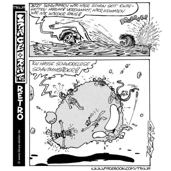 Passend zum warmen Wetter beginnen wir mit einem Retro-Comicstrip von Space-Rat zum Thema „Schwimmbad“:
