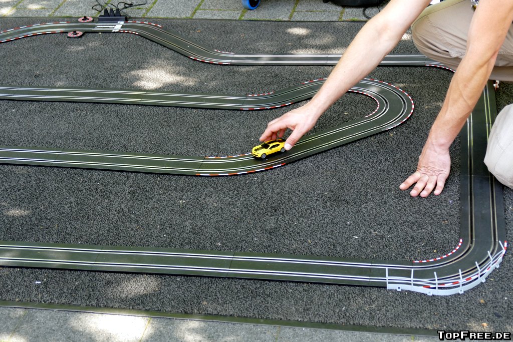 Letztendlich bleibt noch eine aufgebaute Carrera-Bahn, ein Bobby Car-Parcour und ein Transformers-Kickertisch übrig. Wenn die Kids nicht noch eine Runde drehen, ist das Event leider in knapp fünf Minuten vorbei. Noch ein paar Erinnerungsfotos geknippst und das war es. Was mich gewundert hat ist, dass es noch nicht einmal einen Merchandising-Stand gegeben hat. Wo sonst, wenn nicht hier, hätte man Fanartikel und Filme unter die Leute bringen können. Dementsprechend bleibt die Tour wohl nur etwas für hartgesottene Fans, die sich einmal mit den Autos ablichten lassen wollen.