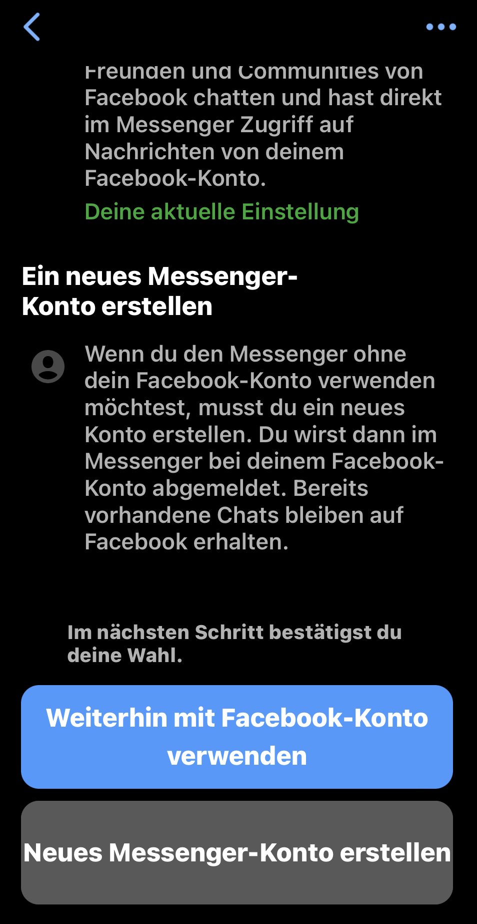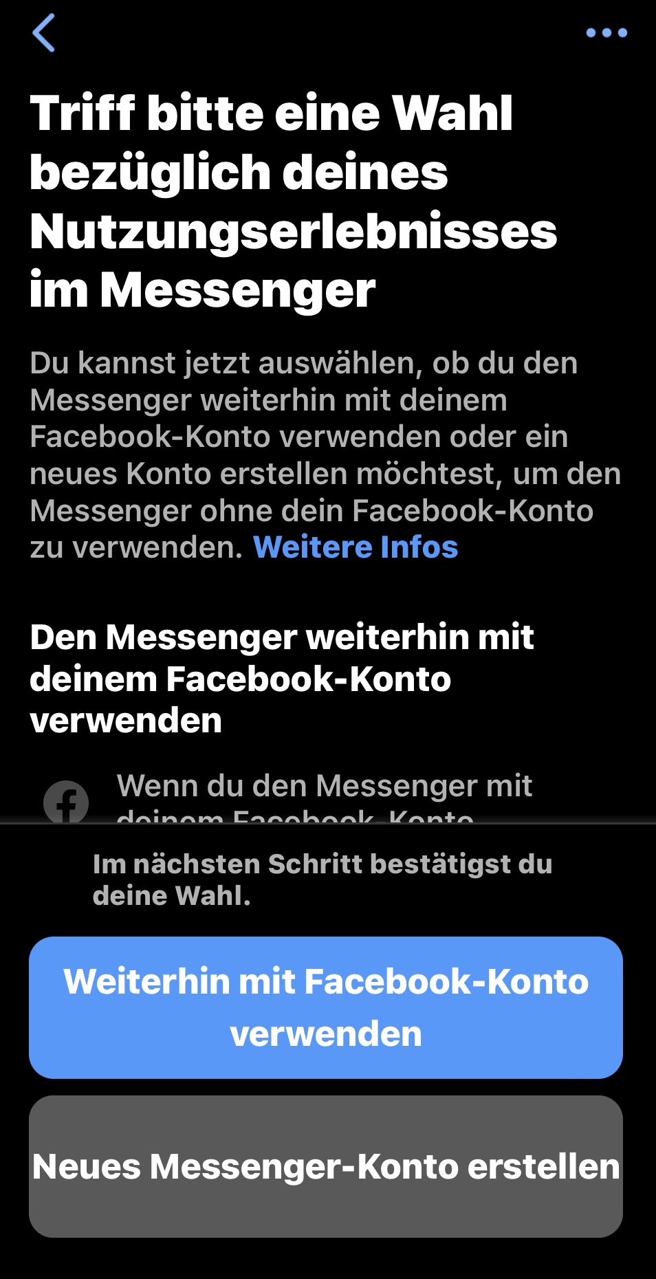 „Du kannst jetzt auswählen, ob du den Messenger weiterhin mit deinem Facebook-Konto verwenden oder ein neues Konto erstellen möchtest, um den Messenger ohne dein Facebook-Konto zu verwenden.“