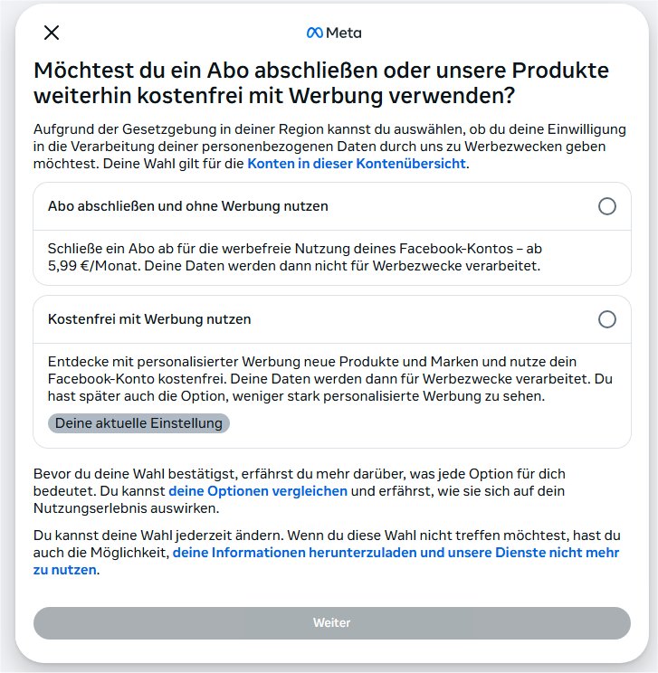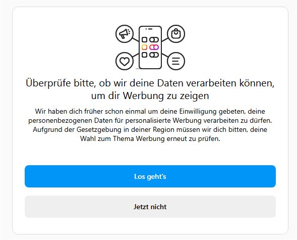 Meta lässt wieder ein Pop-up ausspielen. „Überprüfe bitte, ob wir deine Daten verarbeiten können, um dir Werbung zu zeigen“. Weiter heißt es: „Wir haben dich früher schon einmal um deine Einwilligung gebeten, deine personenbezogenen Daten für personalisierte Werbung verarbeiten zu dürfen. Aufgrund der Gesetzgebung in deiner Region müssen wir dich bitten, deine Wahl zum Thema Werbung erneut zu prüfen.“ Der Hinweis erscheint derzeit auf Instagram und Facebook. Danach gibt es erst einmal einen Wink zum kostenpflichtigen Abo …