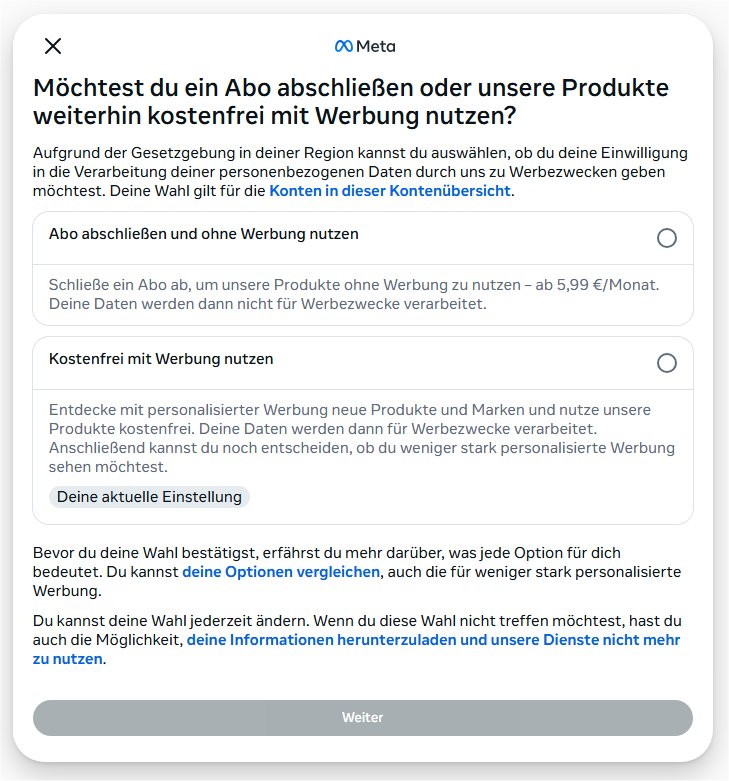 Kurz gesagt stehen weiterhin die beiden Optionen zur Auswahl: Entweder personalisierte Werbung oder man wird als Nutzer der Social Media Dienste von Meta zur Kasse gebeten. Genauer gesagt sind dann 5,99 Euro pro Monat fällig. Für ein Abo der Social Media Kanäle. Eine Statistik wie viele ein solches Abo, besonders mit einem Augenmerk auf Deutschland, abgeschlossen haben, wäre mal interessant. Aber dazu gibt es bisweilen keine evaluierten Daten.