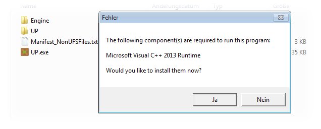 Die Zip-Datei entpackt sind es immerhin 292 MB auf der Festplatte, die verbraucht werden. Im Ordner „WindowsNoEditor“ befindet sich dann die UP.exe für den Spielstart. Ein Klick dort drauf lieferte mir aber erstmal einen Fehler aus, denn mir würde „Microsofrt Visual C++ 2013 Runtime“ fehlen. Installiert und dann geht es aber los!