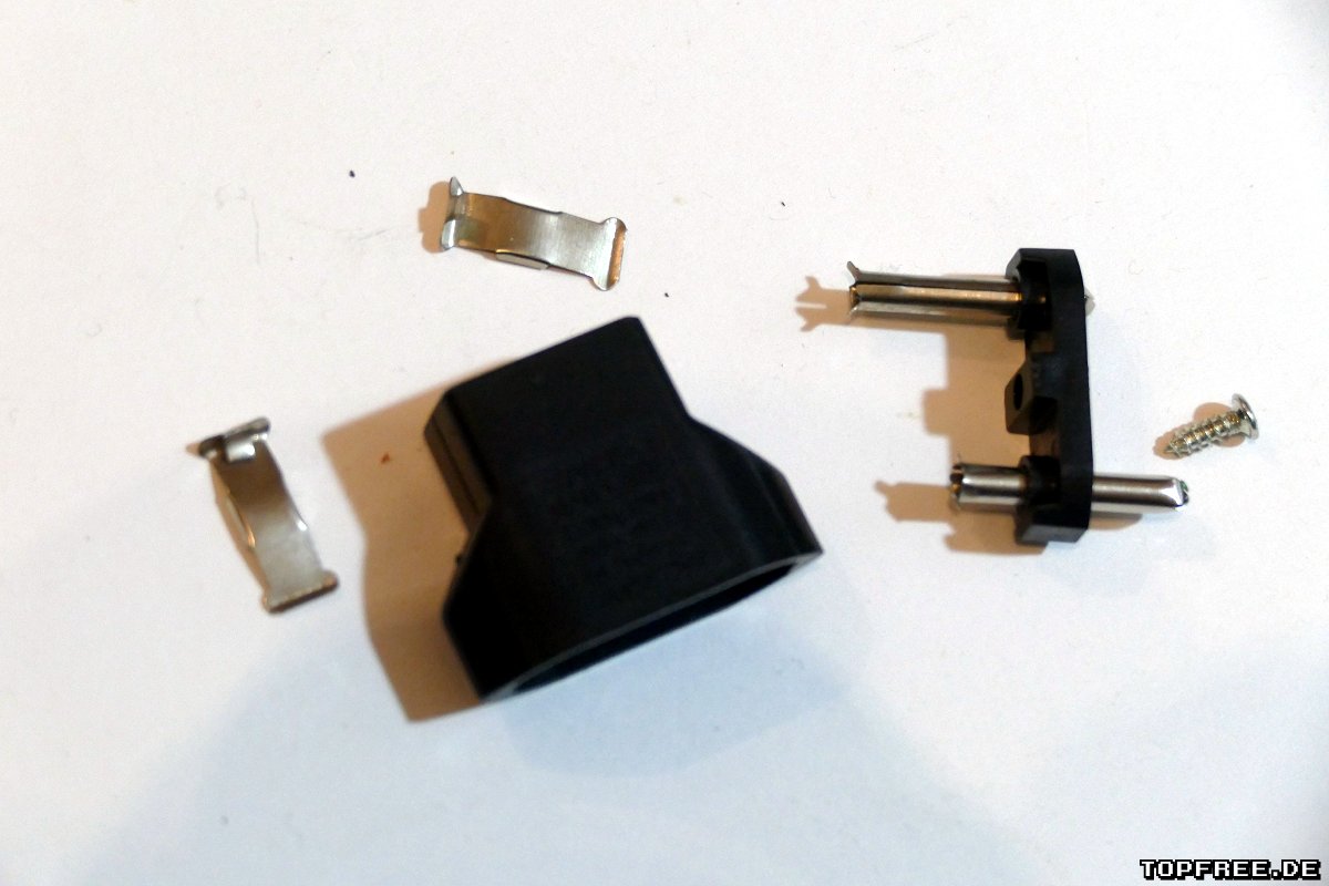 Dieses günstige Modell funktionierte erst gar nicht. Einmal vorne aufgeschraubt, wieder zusammengesteckt und es ging. Sprich das Metall war schon von vorneherein schief angebracht. Nach ein paar Versuchen den Stecker in die Steckdose ein- und auszustecken war dann wieder Finito. Noch einmal aufgeschraubt und das ganze Material war gebrochen (siehe Foto).