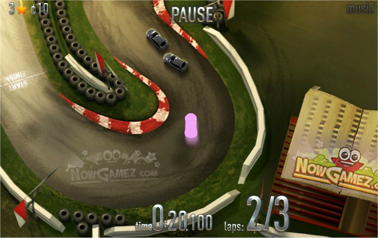 Das Ziel ist klar, Erster werden, die Strecken meistern, Geld sammeln und Upgrades kaufen. Denn in V8 Drift kann der Wagen aufgemotzt werden. Grafisch ist das Menü und die Strecke hübsch anzusehen. Im Stile von Micro Machines steuert man seinen Wagen mit den Pfeiltasten über die Strecken. Dabei gibt es Bonussterne (die den Wagen kurz pink werden lassen, siehe Screenshot) und Geschwindigkeitspfeile. Leider kommt kaum ein wirkliches Drift-Gefühl auf, denn der Wagen steuert sich etwas eigenartig. Nach links und rechts lenken soll wie ein Drift wirken, sieht aber eher ungewollt komisch aus. Die Musikuntermalung ist zudem nichts Besonderes.